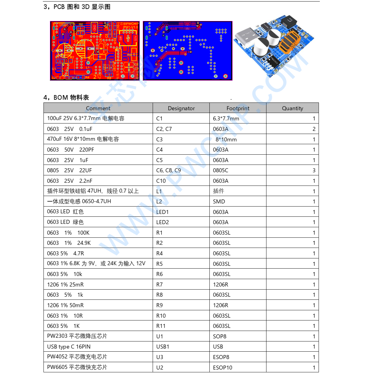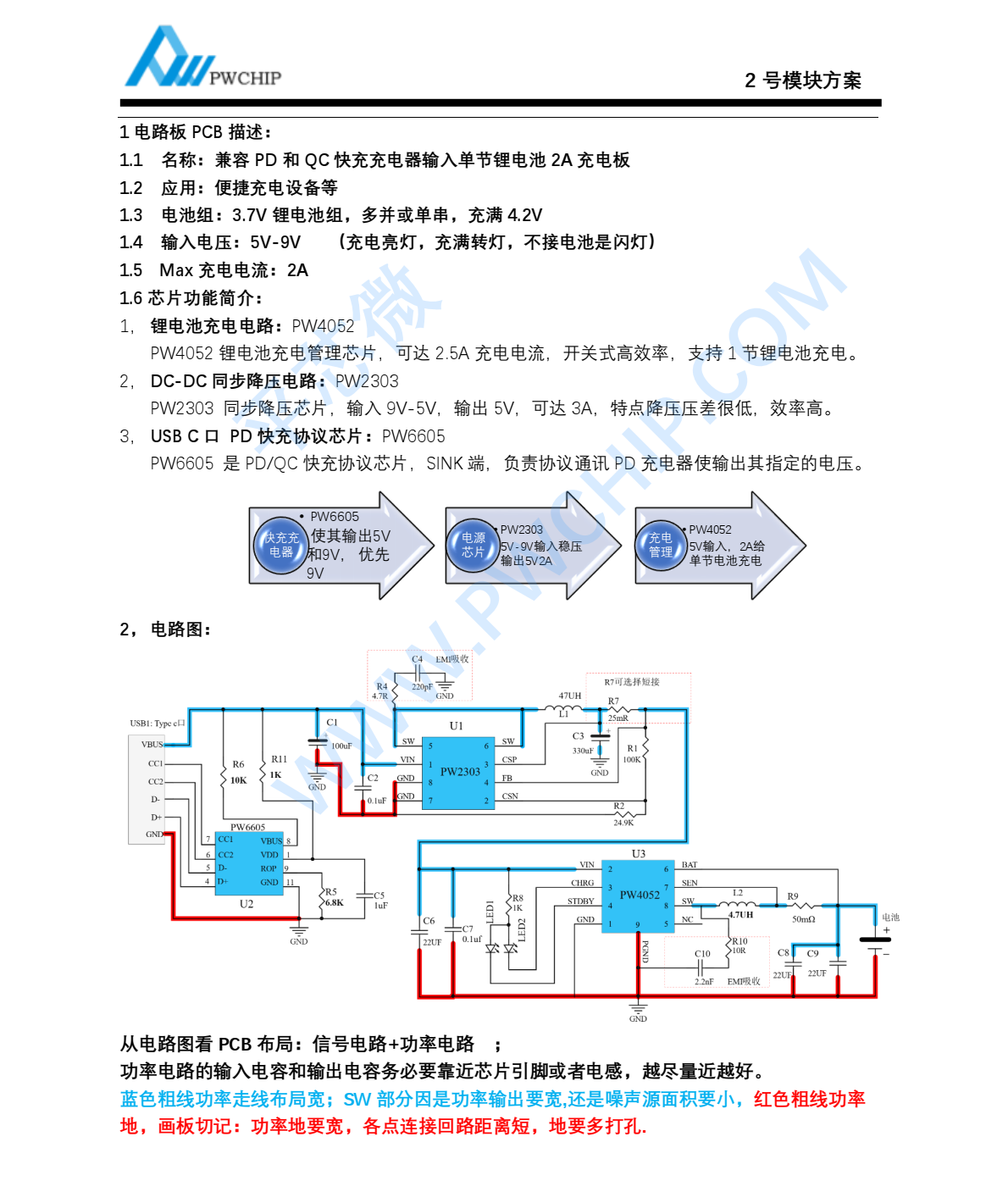 :1 电路板 PCB 描述:1.1 名称: 兼容 PD 和 QC 快充充电器输入单节锂电池 2A 充电板1.2 应用:便捷充电设备等1.3 电池组: 3.7V 锂电池组, 多并或单串,充满 4.2V1.4 输入电压: 5V-9V (充电亮灯,充满转灯,不接电池是闪灯)1.5 Max 充电电流: 2A