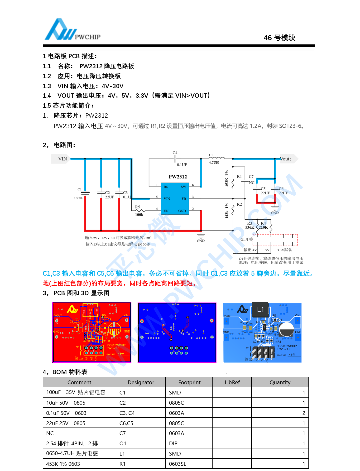 :1 电路板 PCB 描述:1.1 名称: PW2312 降压电路板1.2 应用: 电压降压转换板1.3 VIN 输入电压: 4V-30V1.4 VOUT 输出电压: 4V, 5V, 3.3V(需满足 VIN>VOUT)