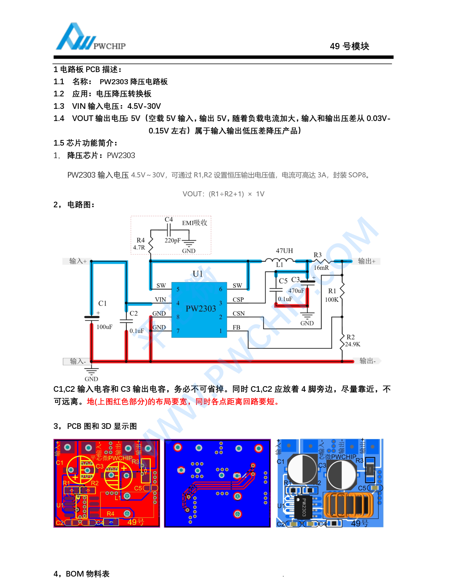 :1 电路板 PCB 描述:1.1 名称: PW2303 降压电路板1.2 应用:电压降压转换板1.3 VIN 输入电压: 4.5V-30V1.4 VOUT 输出电压: 5V(空载 5V 输入, 输出 5V, 随着负载电流加大, 输入和输出压差从 0.03V-0.15V 左右)属于输入输出低压差降压产品)