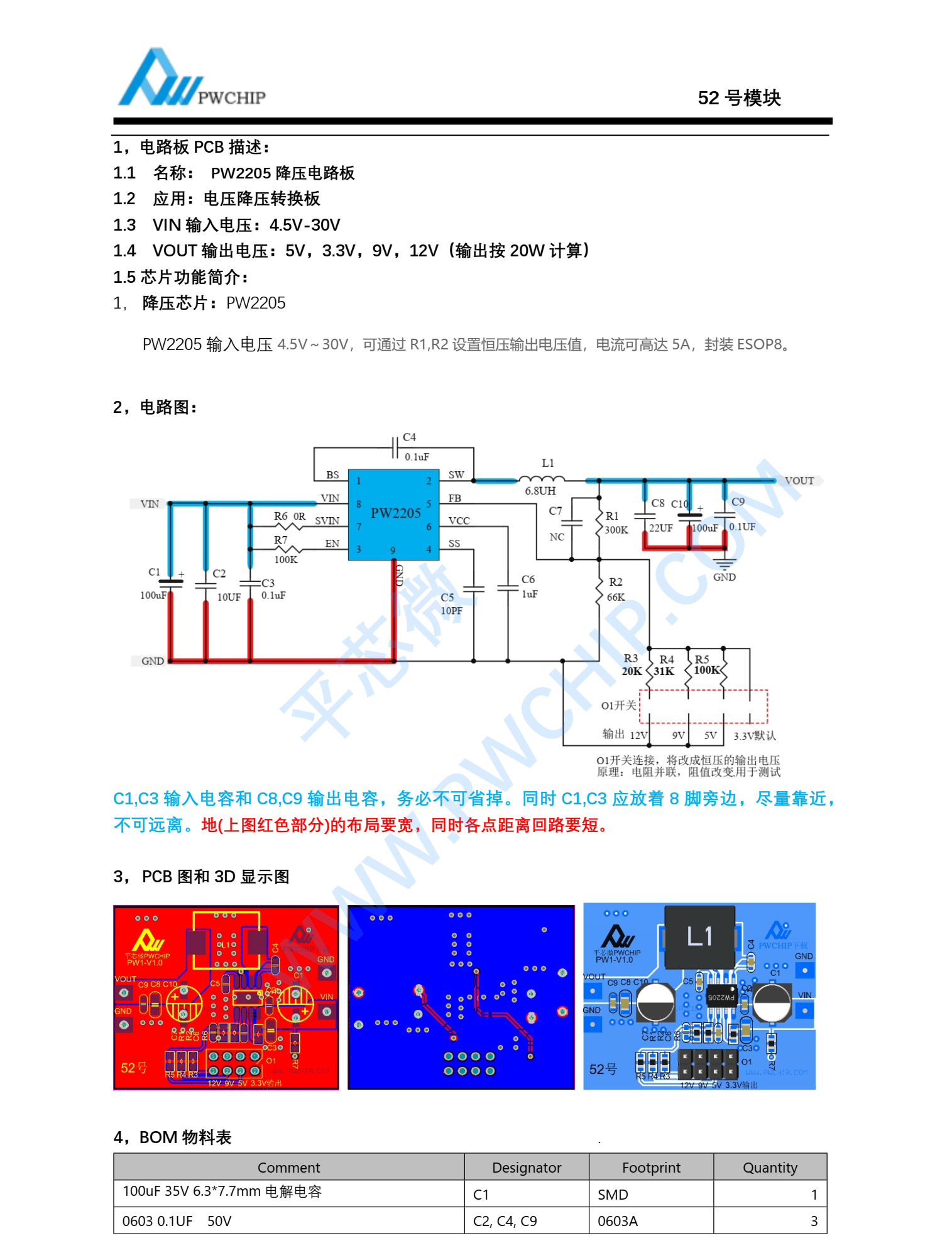 :1, 电路板 PCB 描述:1.1 名称: PW2205 降压电路板1.2 应用:电压降压转换板1.3 VIN 输入电压: 4.5V-30V1.4 VOUT 输出电压: 5V, 3.3V, 9V, 12V(输出按 20W 计算)