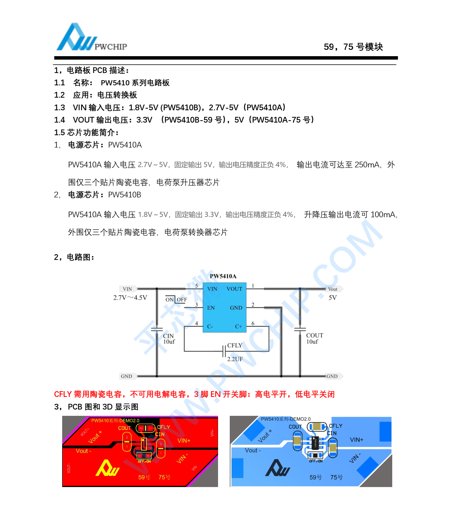 :1, 电路板 PCB 描述:1.1 名称: PW5410 系列电路板1.2 应用:电压转换板1.3 VIN 输入电压: 1.8V-5V (PW5410B), 2.7V-5V(PW5410A)1.4 VOUT 输出电压: 3.3V (PW5410B-59 号) , 5V(PW5410A-75 号)