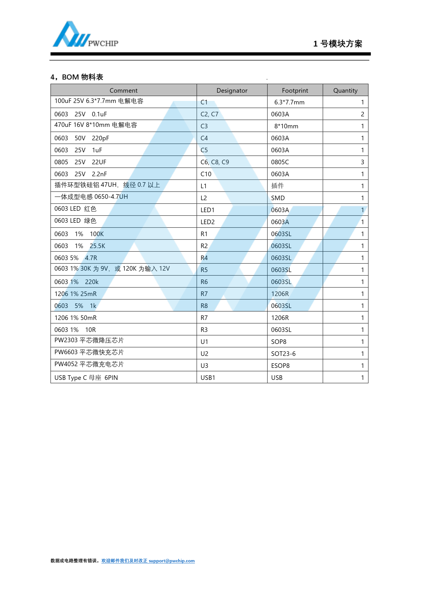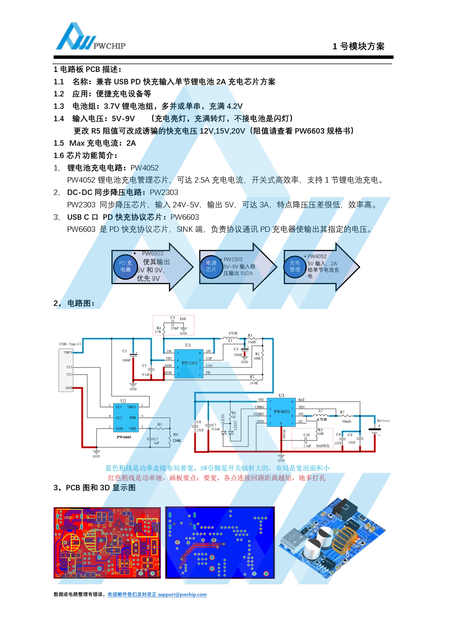 :1 电路板 PCB 描述:1.1 名称: 兼容 USB PD 快充输入单节锂电池 2A 充电芯片方案1.2 应用:便捷充电设备等1.3 电池组: 3.7V 锂电池组,多并或单串, 充满 4.2V1.4 输入电压: 5V-9V (充电亮灯,充满转灯,不接电池是闪灯)更改 R5 阻值可改成诱骗的快充电压 12V,15V,20V(阻值请查看 PW6603 规格书)1.5 Max 充电电流: 2A