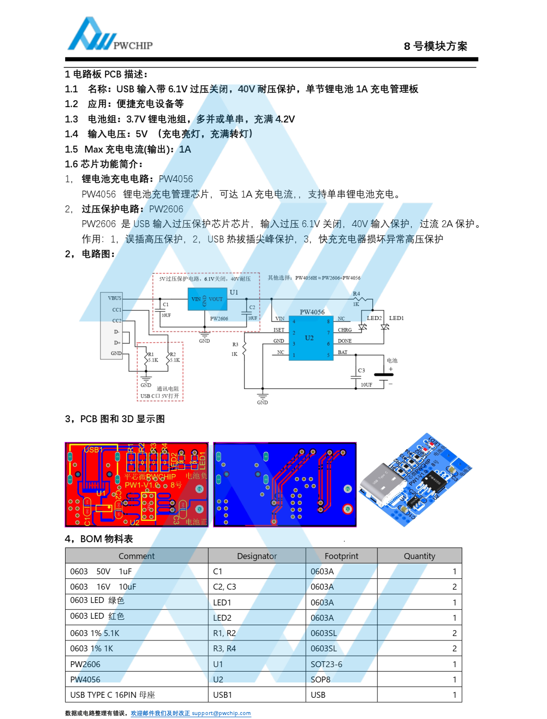 :1 电路板 PCB 描述:1.1 名称: USB 输入带 6.1V 过压关闭, 40V 耐压保护, 单节锂电池 1A 充电管理板1.2 应用:便捷充电设备等1.3 电池组: 3.7V 锂电池组,多并或单串, 充满 4.2V1.4 输入电压: 5V (充电亮灯,充满转灯)1.5 Max 充电电流(输出): 1A