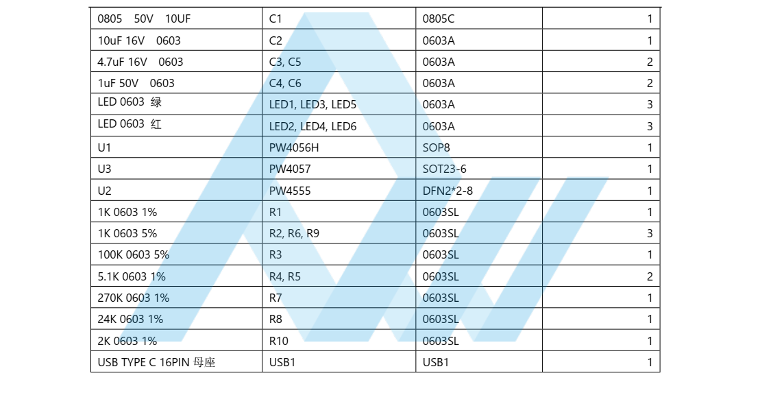 :1 电路板 PCB 描述:1.1 名称: USB C 输入, 集成 OVP 过压保护锂电池充电产品1.2 应用:便捷充电设备等1.3 电池组: 3.7V/3.8V 锂电池组,多并或单串,可选充满 4.35V(12 号板) /4.2V(13 号板)1.4 输入电压: 5V (充电亮灯,充满转灯)1.5 Max 充电电流(输出): 0.5A(PW4555/PW4057) , 1A(PW4056H)