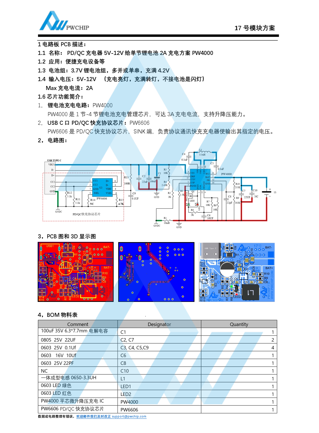 :1 电路板 PCB 描述:1.1 名称: PD/QC 充电器 5V-12V 给单节锂电池 2A 充电方案 PW40001.2 应用:便捷充电设备等1.3 电池组: 3.7V 锂电池组,多并或单串,充满 4.2V1.4 输入电压: 5V-12V (充电亮灯,充满转灯,不接电池是闪灯)Max 充电电流: 2A