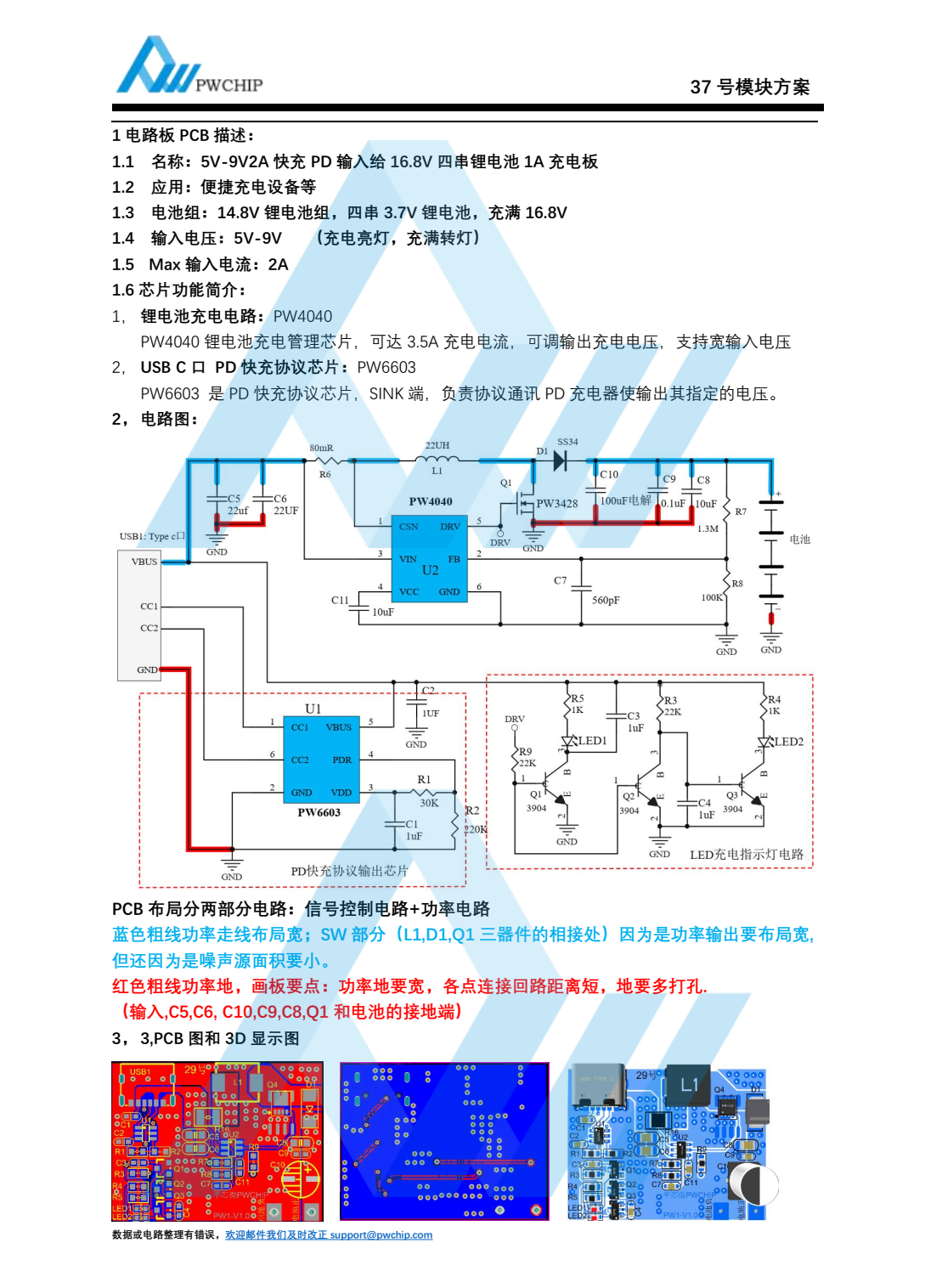 :1 电路板 PCB 描述:1.1 名称: 5V-9V2A 快充 PD 输入给 16.8V 四串锂电池 1A 充电板1.2 应用:便捷充电设备等1.3 电池组: 14.8V 锂电池组,四串 3.7V 锂电池, 充满 16.8V1.4 输入电压: 5V-9V (充电亮灯,充满转灯)1.5 Max 输入电流: 2A