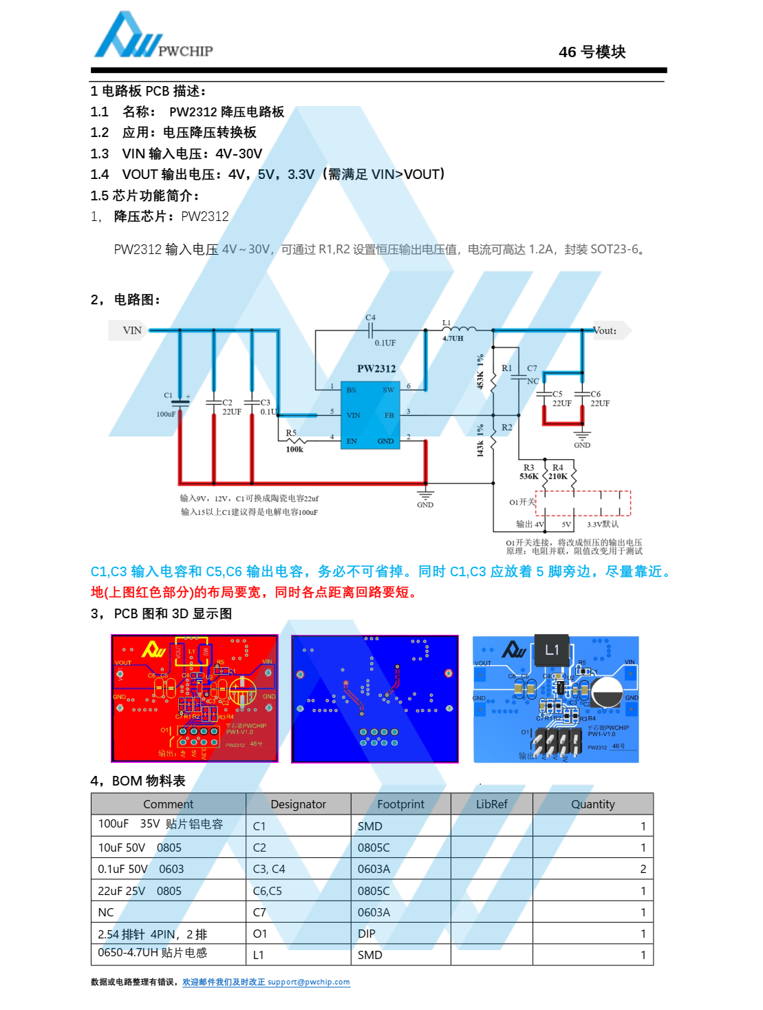 :1 电路板 PCB 描述:1.1 名称: PW2312 降压电路板1.2 应用:电压降压转换板1.3 VIN 输入电压: 4V-30V1.4 VOUT 输出电压: 4V, 5V, 3.3V(需满足 VIN>VOUT)
