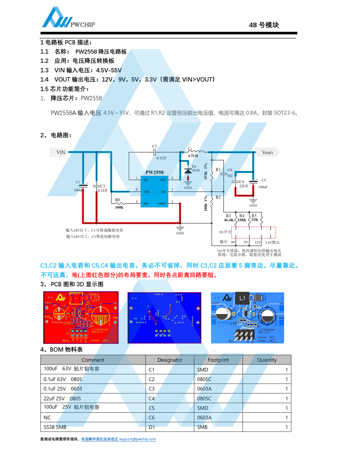 :1 电路板 PCB 描述:1.1 名称: PW2558 降压电路板1.2 应用:电压降压转换板1.3 VIN 输入电压: 4.5V-55V1.4 VOUT 输出电压: 12V, 9V, 5V, 3.3V(需满足 VIN>VOUT)