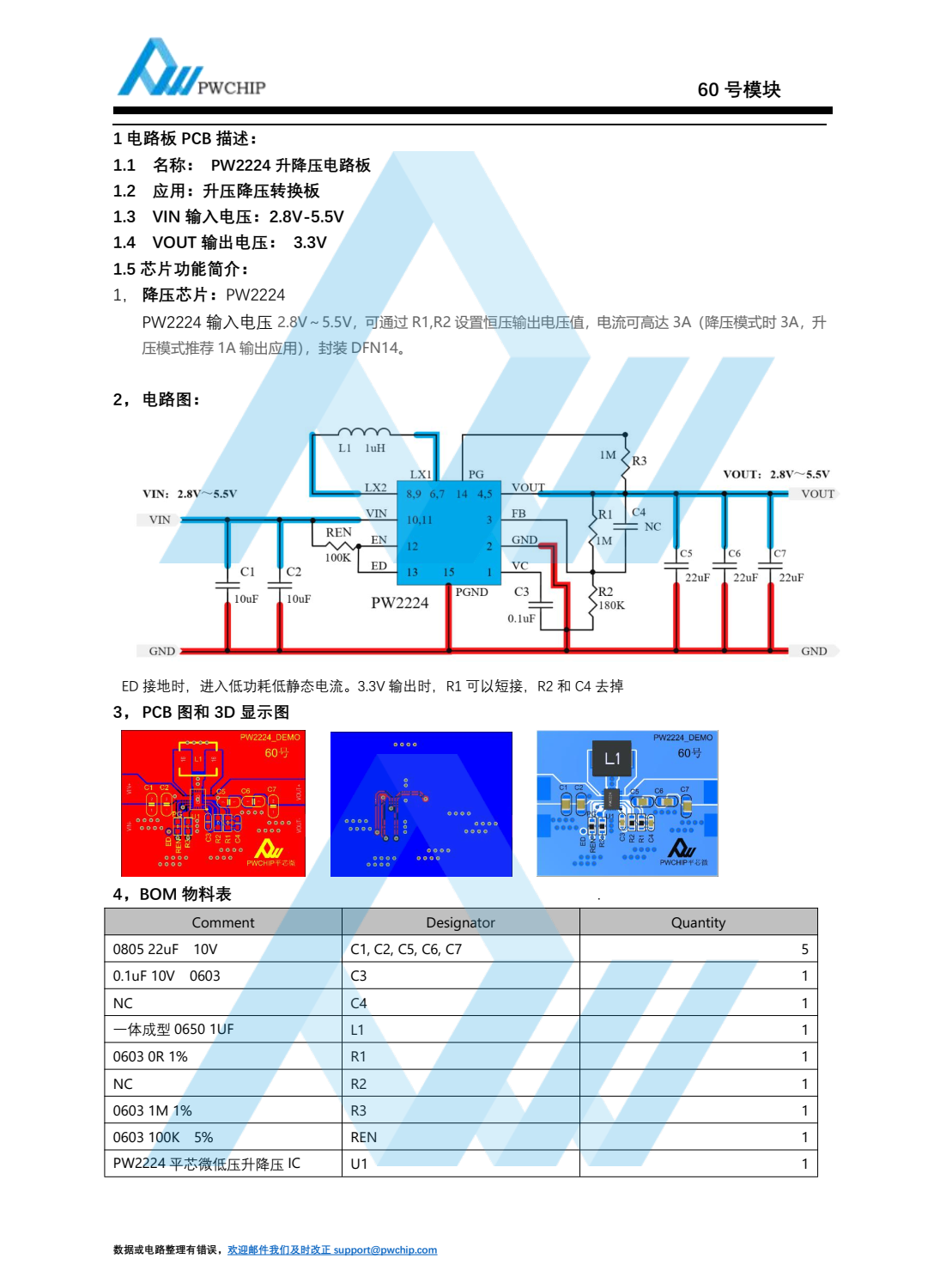 :1 电路板 PCB 描述:1.1 名称: PW2224 升降压电路板1.2 应用:升压降压转换板1.3 VIN 输入电压: 2.8V-5.5V1.4 VOUT 输出电压: 3.3V
