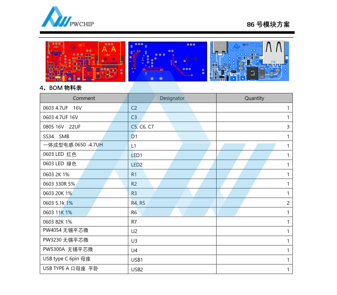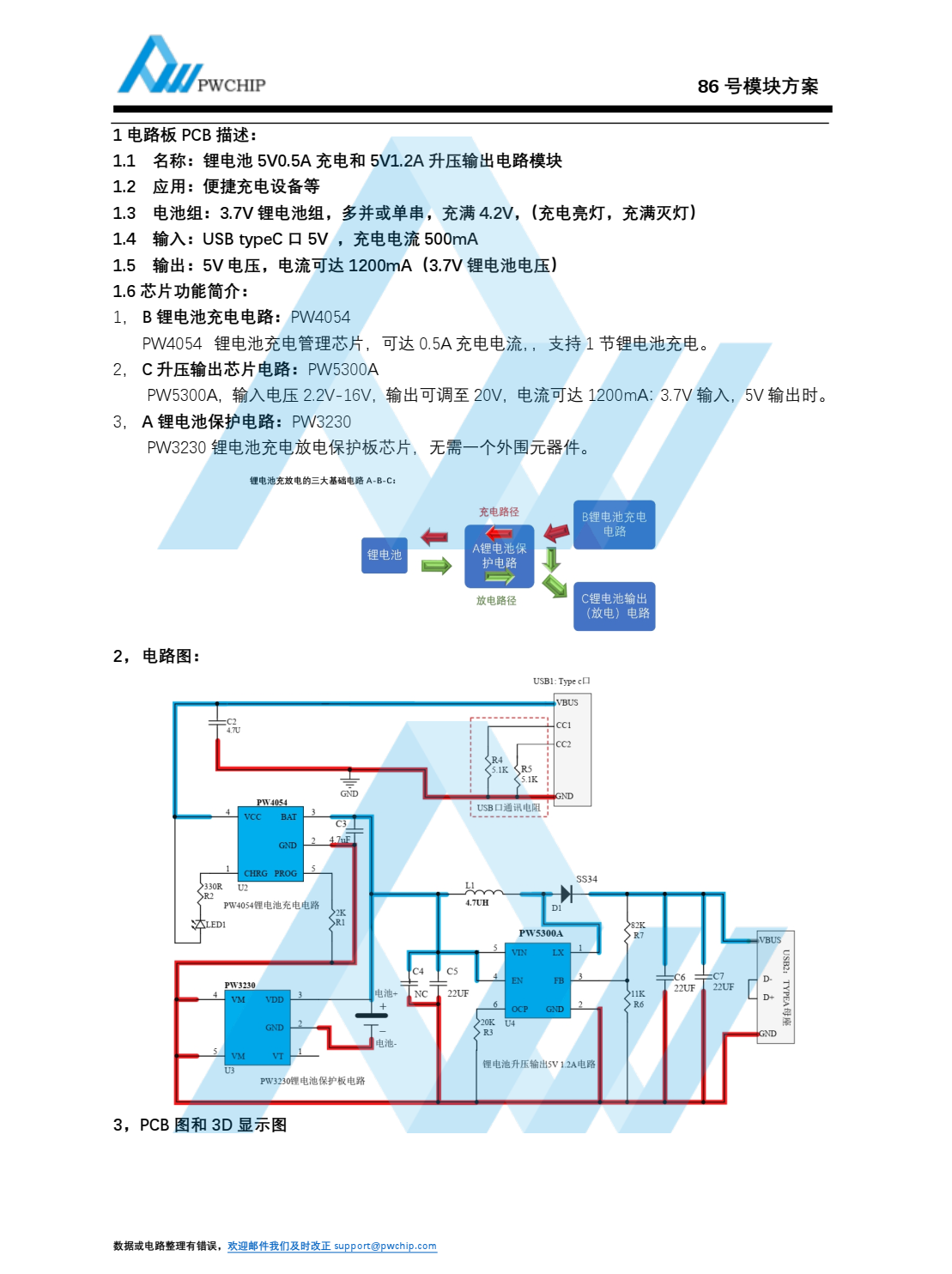 :1 电路板 PCB 描述:1.1 名称: 锂电池 5V0.5A 充电和 5V1.2A 升压输出电路模块1.2 应用:便捷充电设备等1.3 电池组: 3.7V 锂电池组,多并或单串, 充满 4.2V, (充电亮灯,充满灭灯)1.4 输入: USB typeC 口 5V , 充电电流 500mA1.5 输出: 5V 电压, 电流可达 1200mA(3.7V 锂电池电压)