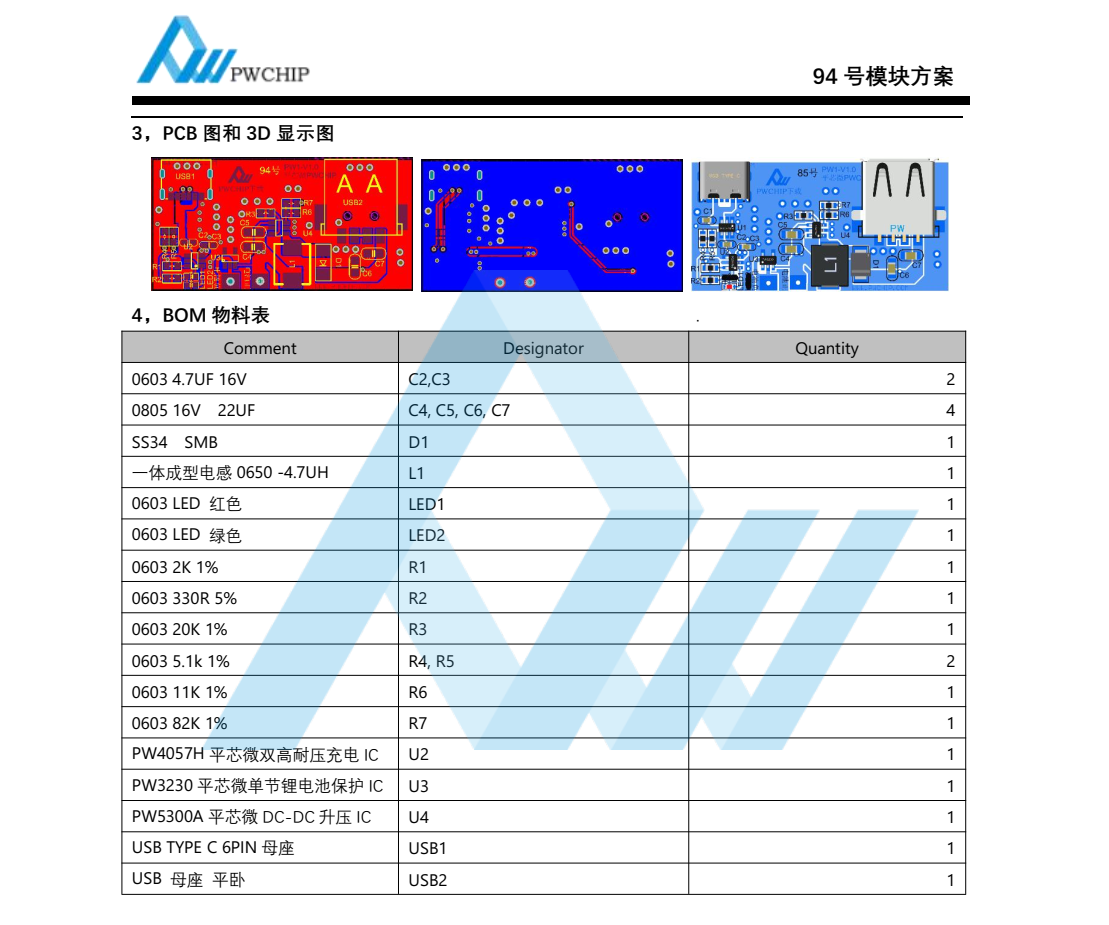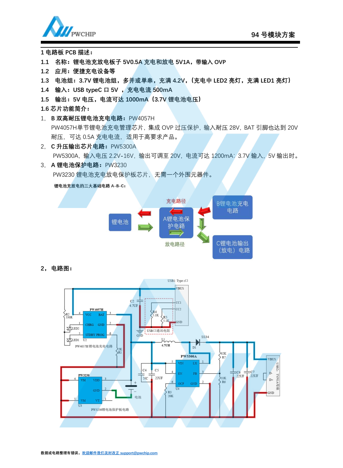 :1.1 名称: 锂电池充放电板子 5V0.5A 充电和放电 5V1A, 带输入 OVP1.2 应用: 便捷充电设备等1.3 电池组: 3.7V 锂电池组, 多并或单串, 充满 4.2V, (充电中 LED2 亮灯, 充满 LED1 亮灯)1.4 输入: USB typeC 口 5V , 充电电流 500mA1.5 输出: 5V 电压, 电流可达 1000mA(3.7V 锂电池电压)