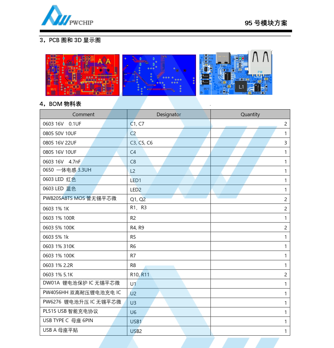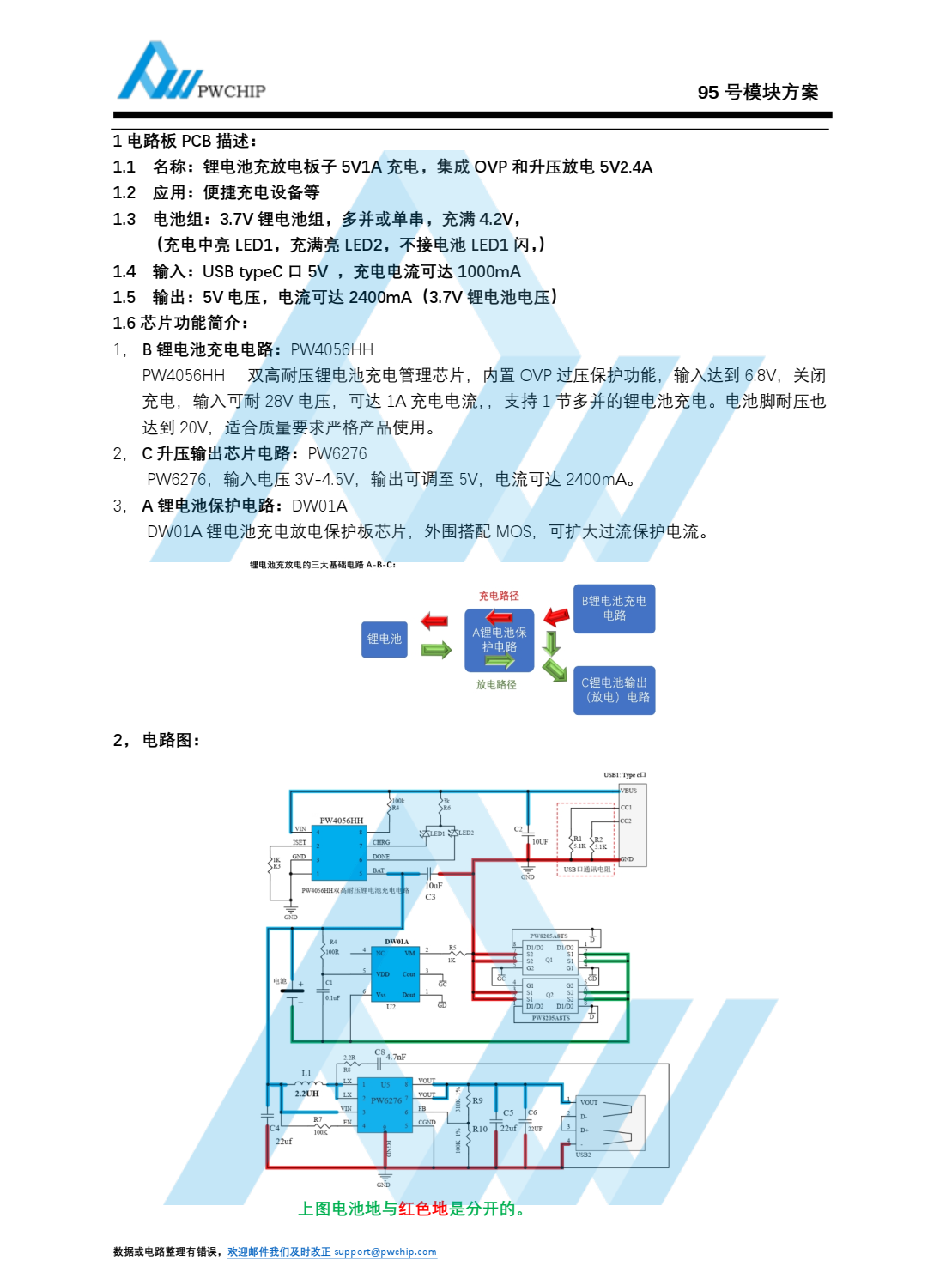 :1 电路板 PCB 描述:1.1 名称: 锂电池充放电板子 5V1A 充电, 集成 OVP 和升压放电 5V2.4A1.2 应用:便捷充电设备等1.3 电池组: 3.7V 锂电池组,多并或单串, 充满 4.2V,(充电中亮 LED1,充满亮 LED2, 不接电池 LED1 闪, )1.4 输入: USB typeC 口 5V ,充电电流可达 1000mA1.5 输出: 5V 电压, 电流可达 2400mA(3.7V 锂电池电压)