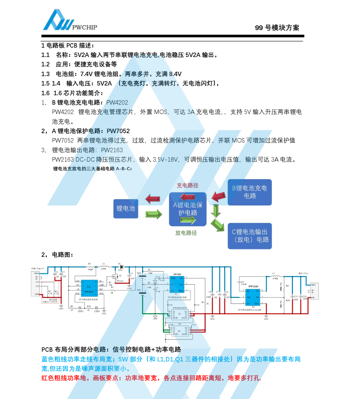 :1 电路板 PCB 描述:1.1 名称: 5V2A 输入两节串联锂电池充电,电池稳压 5V2A 输出,1.2 应用:便捷充电设备等1.3 电池组: 7.4V 锂电池组,两串多并, 充满 8.4V1.5 1.4 输入电压: 5V2A (充电亮灯,充满转灯,无电池闪灯)