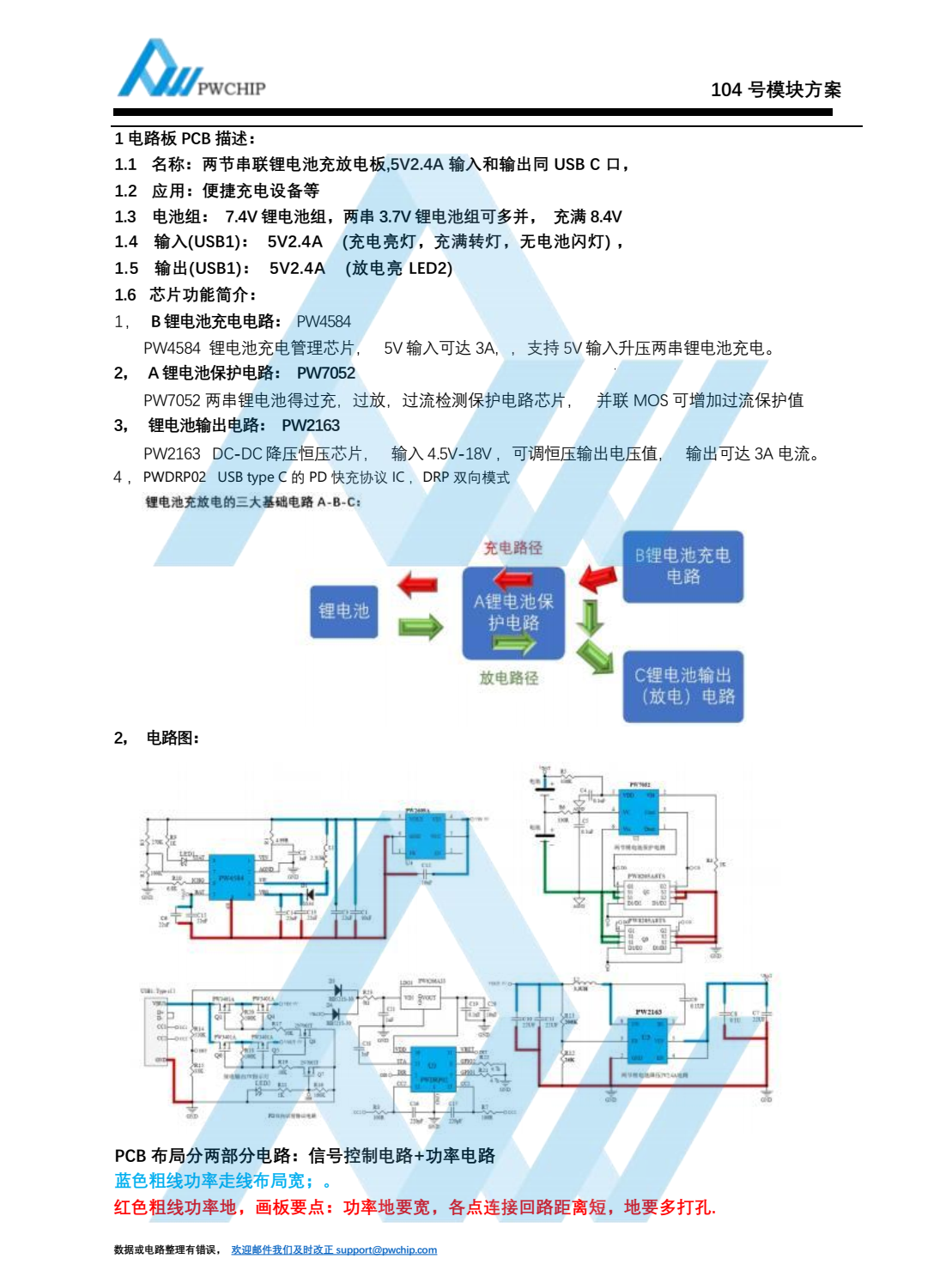 :1 电路板 PCB 描述:1.1 名称:两节串联锂电池充放电板,5V2.4A 输入和输出同 USB C 口,1.2 应用:便捷充电设备等1.3 电池组: 7.4V 锂电池组,两串 3.7V 锂电池组可多并, 充满 8.4V1.4 输入(USB1): 5V2.4A (充电亮灯,充满转灯,无电池闪灯) ,1.5 输出(USB1): 5V2.4A (放电亮 LED2)