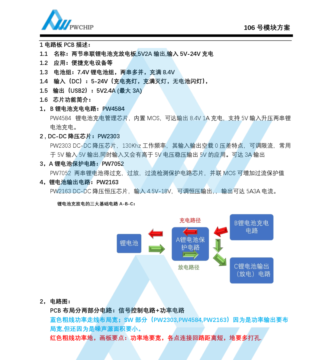 :1 电路板 PCB 描述:1.1 名称:两节串联锂电池充放电板,5V2A 输出,输入 5V-24V 充电1.2 应用:便捷充电设备等1.3 电池组: 7.4V 锂电池组,两串多并, 充满 8.4V1.4 输入(DC): 5-24V(充电亮灯,充满灭灯,无电池闪灯) ,1.5 输出(USB2): 5V2.4A (最大 3A)