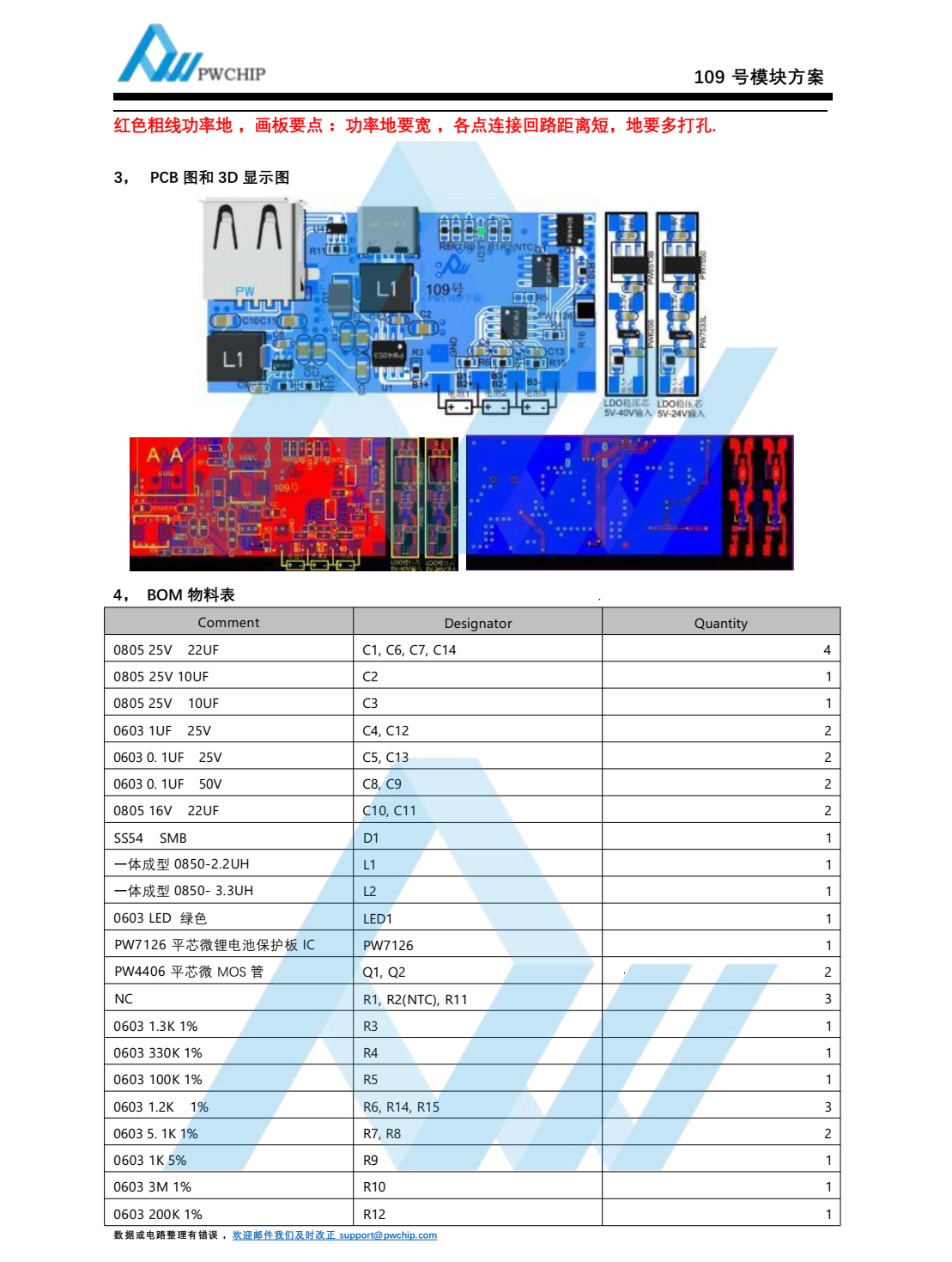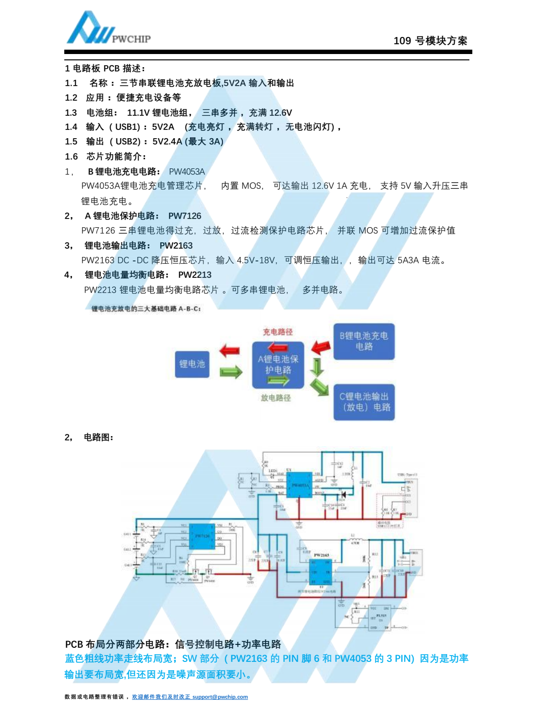 :1 电路板 PCB 描述:1.1 名称: 三节串联锂电池充放电板,5V2A 输入和输出1.2 应用: 便捷充电设备等1.3 电池组: 11.1V 锂电池组, 三串多并, 充满 12.6V1.4 输入(USB1) : 5V2A (充电亮灯, 充满转灯, 无电池闪灯) ,1.5 输出(USB2) : 5V2.4A (最大 3A)