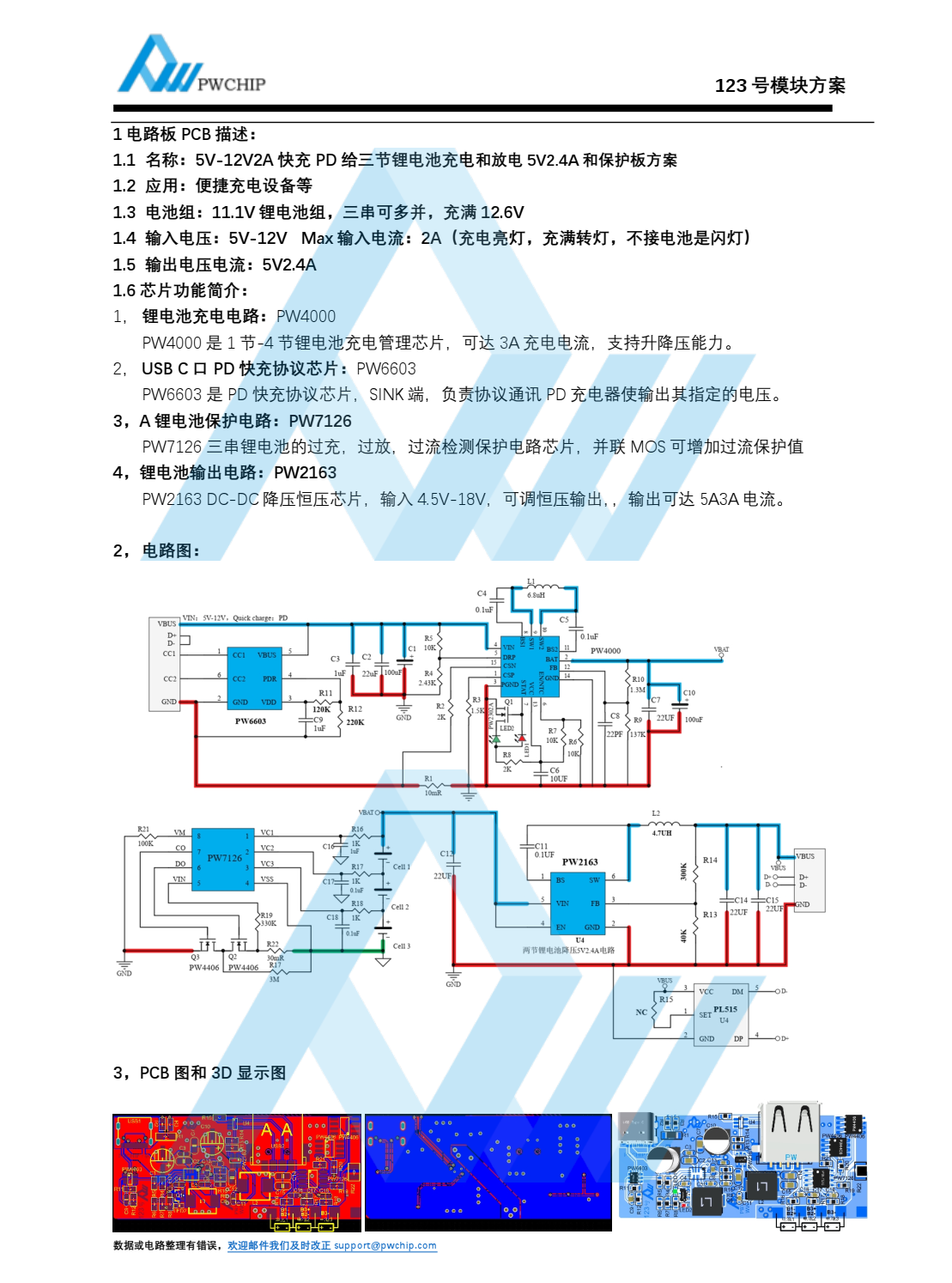 :1 电路板 PCB 描述:1.1 名称: 5V-12V2A 快充 PD 给三节锂电池充电和放电 5V2.4A 和保护板方案1.2 应用:便捷充电设备等1.3 电池组: 11.1V 锂电池组,三串可多并,充满 12.6V1.4 输入电压: 5V-12V Max 输入电流: 2A(充电亮灯,充满转灯,不接电池是闪灯)1.5 输出电压电流: 5V2.4A