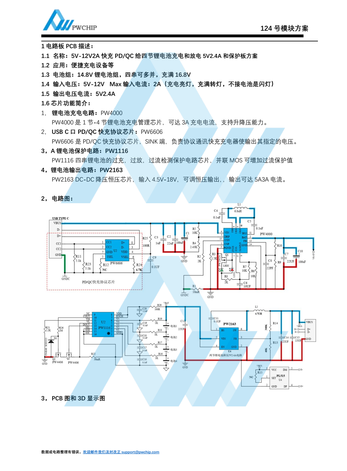 :1.1 名称: 5V-12V2A 快充 PD/QC 给四节锂电池充电和放电 5V2.4A 和保护板方案1.2 应用: 便捷充电设备等1.3 电池组: 14.8V 锂电池组, 四串可多并, 充满 16.8V1.4 输入电压: 5V-12V Max 输入电流: 2A(充电亮灯, 充满转灯, 不接电池是闪灯)1.5 输出电压电流: 5V2.4A