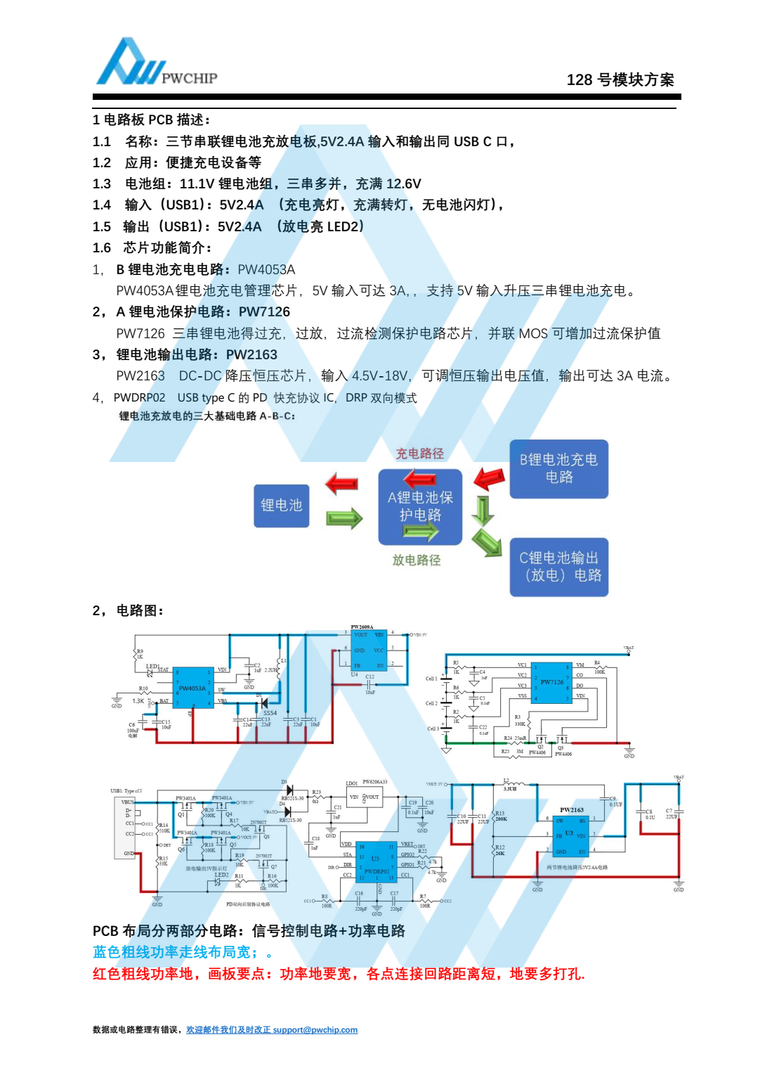 :1 电路板 PCB 描述:1.1 名称: 三节串联锂电池充放电板,5V2.4A 输入和输出同 USB C 口,1.2 应用: 便捷充电设备等1.3 电池组: 11.1V 锂电池组, 三串多并, 充满 12.6V1.4 输入(USB1) : 5V2.4A (充电亮灯, 充满转灯, 无电池闪灯) ,1.5 输出(USB1) : 5V2.4A (放电亮 LED2)