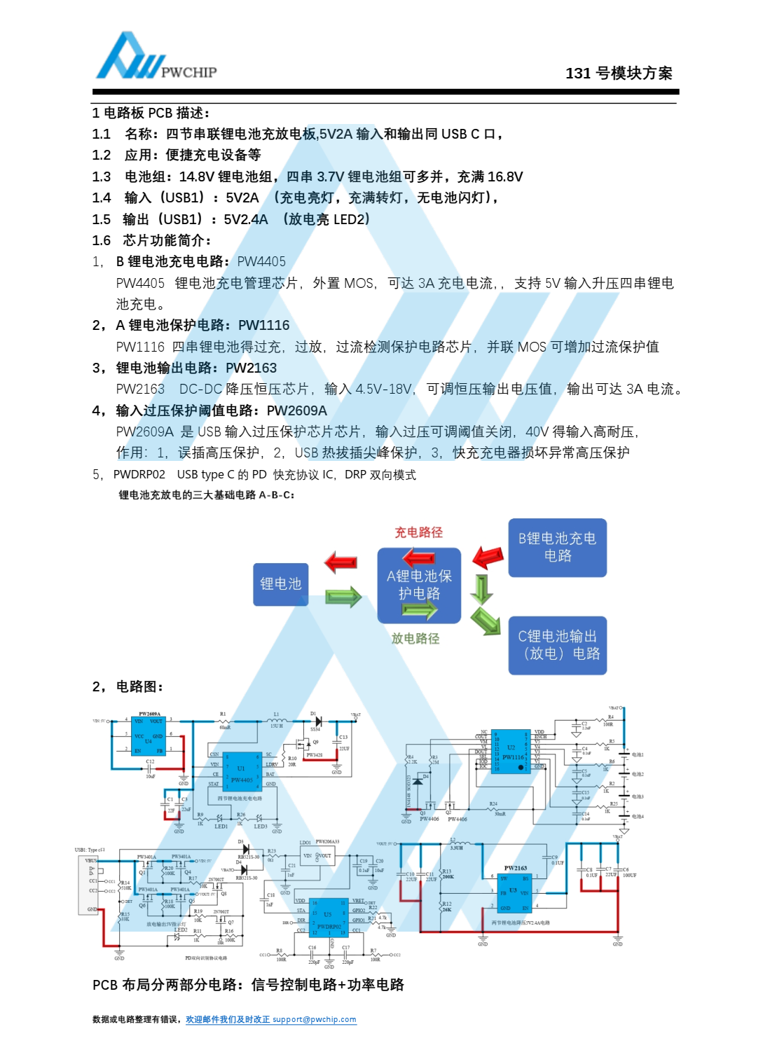 :1 电路板 PCB 描述:1.1 名称:四节串联锂电池充放电板,5V2A 输入和输出同 USB C 口,1.2 应用:便捷充电设备等1.3 电池组: 14.8V 锂电池组,四串 3.7V 锂电池组可多并, 充满 16.8V1.4 输入(USB1): 5V2A (充电亮灯,充满转灯,无电池闪灯) ,1.5 输出(USB1): 5V2.4A (放电亮 LED2)