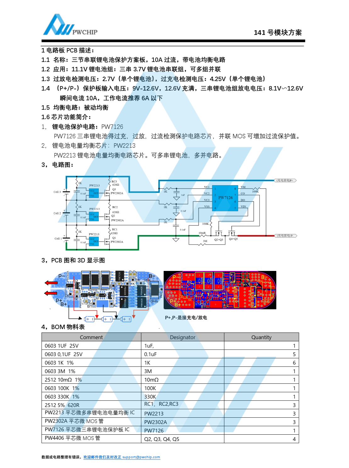 :1 电路板 PCB 描述:1.1 名称:三节串联锂电池保护方案板, 10A 过流,带电池均衡电路1.2 应用: 11.1V 锂电池组:三串 3.7V 锂电池串联组,可多组并联1.3 过放电检测电压: 2.7V(单个锂电池) ,过充电检测电压: 4.25V(单个锂电池)1.4 (P+/P-)保护板输入电压: 9V-12.6V, 12.6V 充满,三串锂电池组放电电压: 8.1V∽12.6V瞬间电流 10A,工作电流推荐 6A 以下1.5 均衡电路:被动均衡