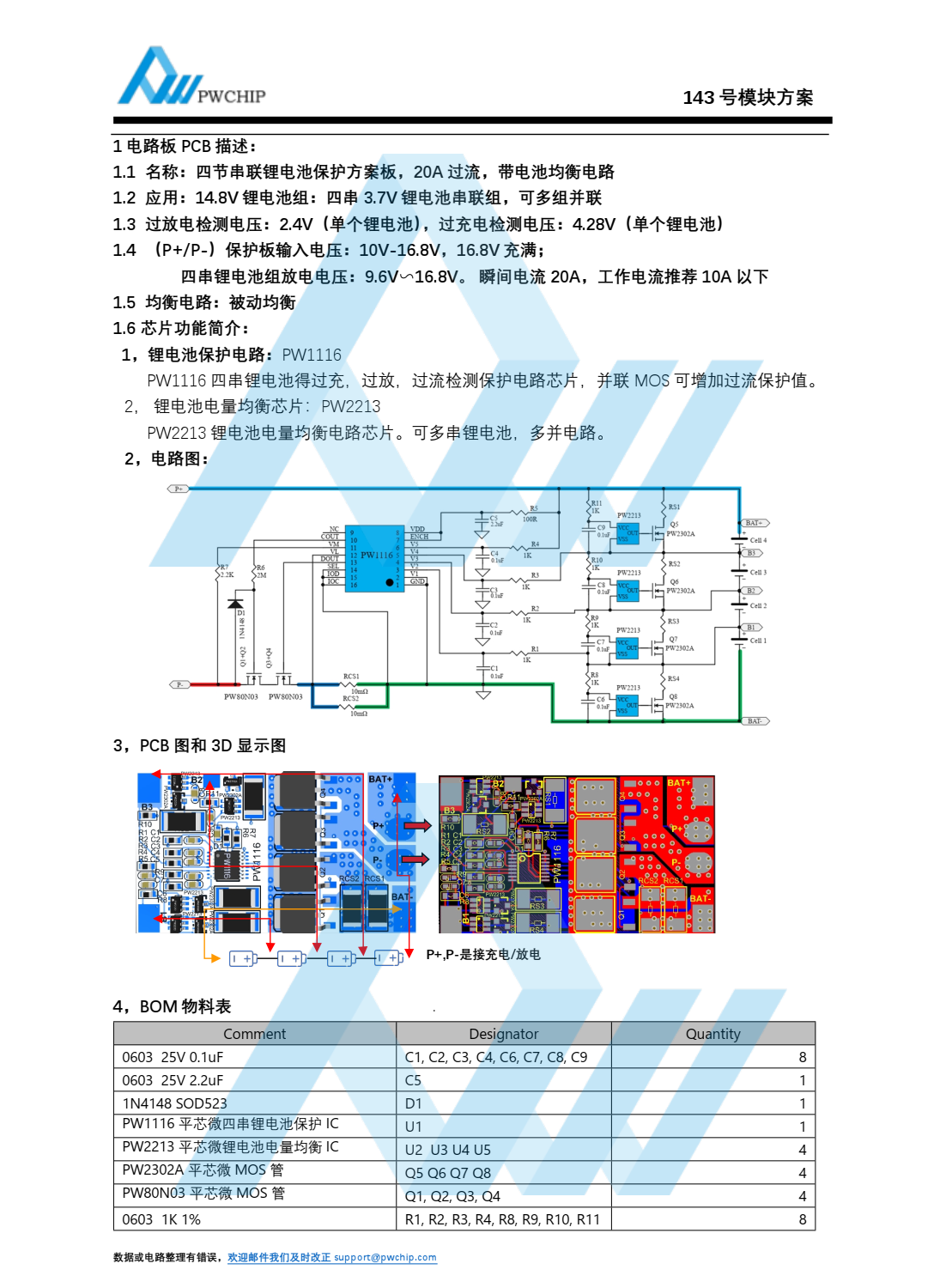 :1 电路板 PCB 描述:1.1 名称:四节串联锂电池保护方案板, 20A 过流,带电池均衡电路1.2 应用: 14.8V 锂电池组:四串 3.7V 锂电池串联组,可多组并联1.3 过放电检测电压: 2.4V(单个锂电池) ,过充电检测电压: 4.28V(单个锂电池)1.4 (P+/P-)保护板输入电压: 10V-16.8V, 16.8V 充满;四串锂电池组放电电压: 9.6V∽16.8V。 瞬间电流 20A,工作电流推荐 10A 以下1.5 均衡电路:被动均衡