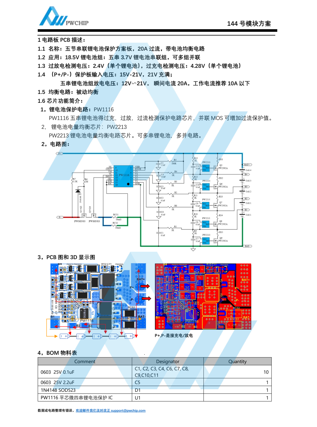 五节串联锂电池保护方案板, 20A 过流, 带电池均衡电路-144号