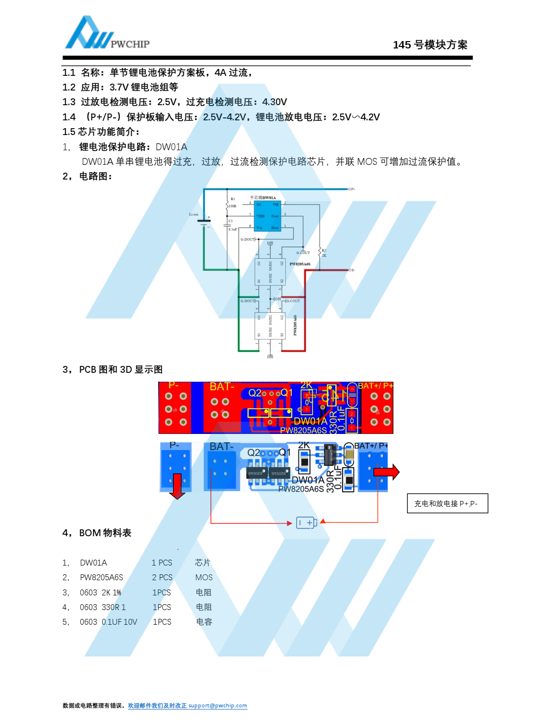 :1.1 名称:单节锂电池保护方案板, 4A 过流,1.2 应用: 3.7V 锂电池组等1.3 过放电检测电压: 2.5V,过充电检测电压: 4.30V1.4 (P+/P-)保护板输入电压: 2.5V-4.2V,锂电池放电电压: 2.5V∽4.2V