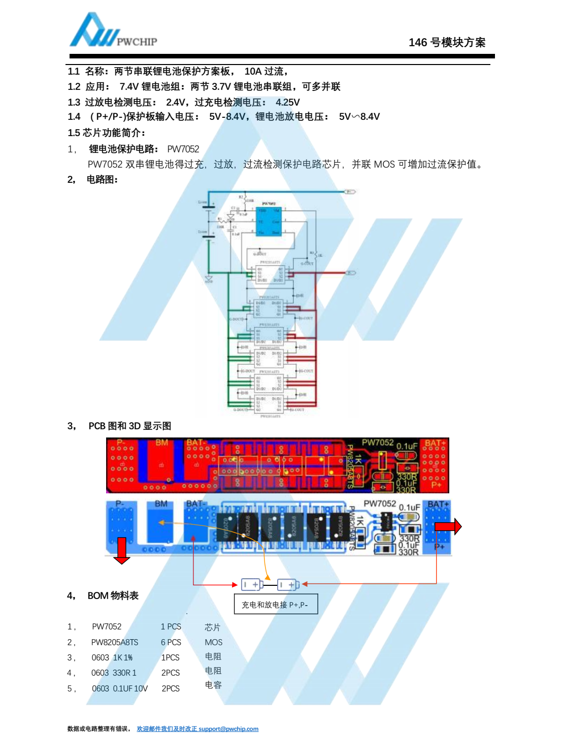 :1.1 名称:两节串联锂电池保护方案板, 10A 过流,1.2 应用: 7.4V 锂电池组:两节 3.7V 锂电池串联组,可多并联1.3 过放电检测电压: 2.4V,过充电检测电压: 4.25V1.4 (P+/P-)保护板输入电压: 5V-8.4V,锂电池放电电压: 5V∽8.4V