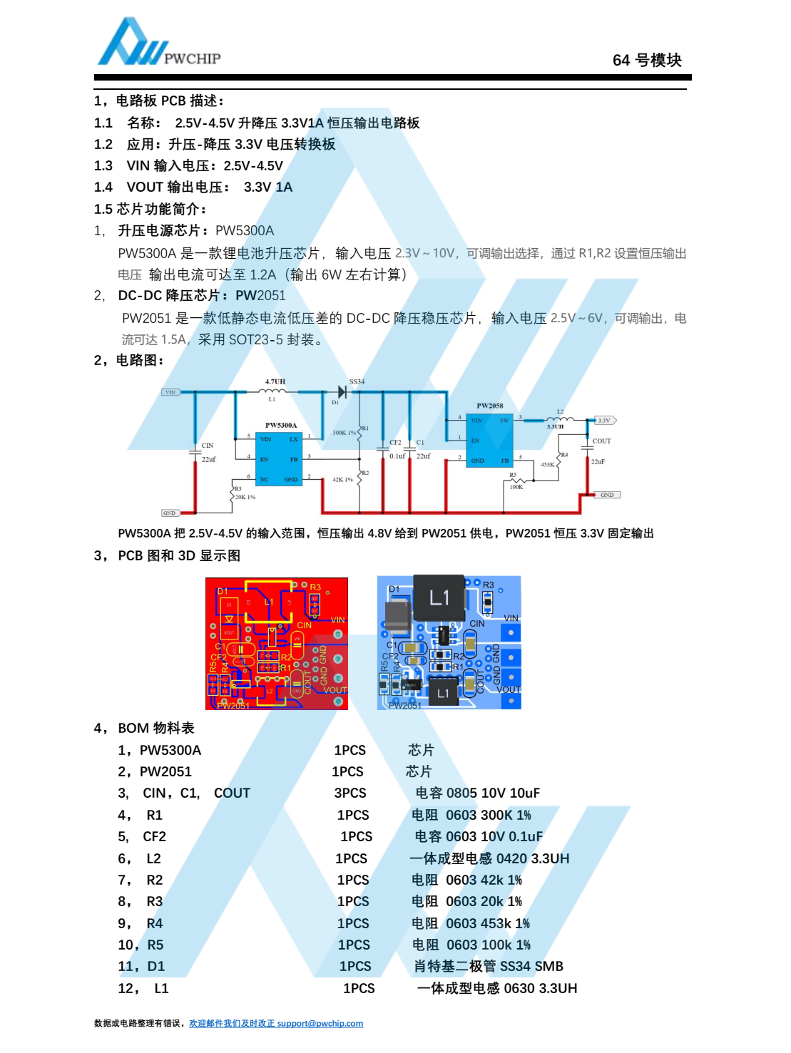 :1, 电路板 PCB 描述:1.1 名称: 2.5V-4.5V 升降压 3.3V1A 恒压输出电路板1.2 应用: 升压-降压 3.3V 电压转换板1.3 VIN 输入电压: 2.5V-4.5V1.4 VOUT 输出电压: 3.3V 1A