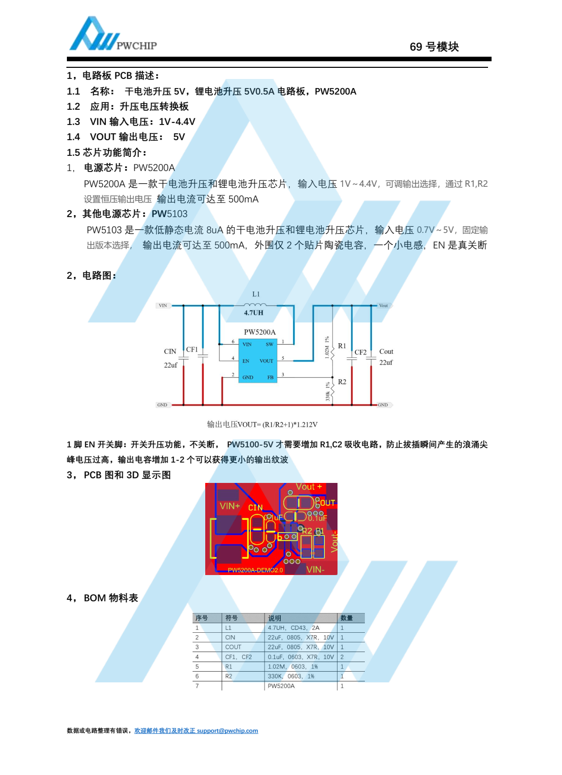 :1, 电路板 PCB 描述:1.1 名称: 干电池升压 5V, 锂电池升压 5V0.5A 电路板, PW5200A1.2 应用: 升压电压转换板1.3 VIN 输入电压: 1V-4.4V1.4 VOUT 输出电压: 5V