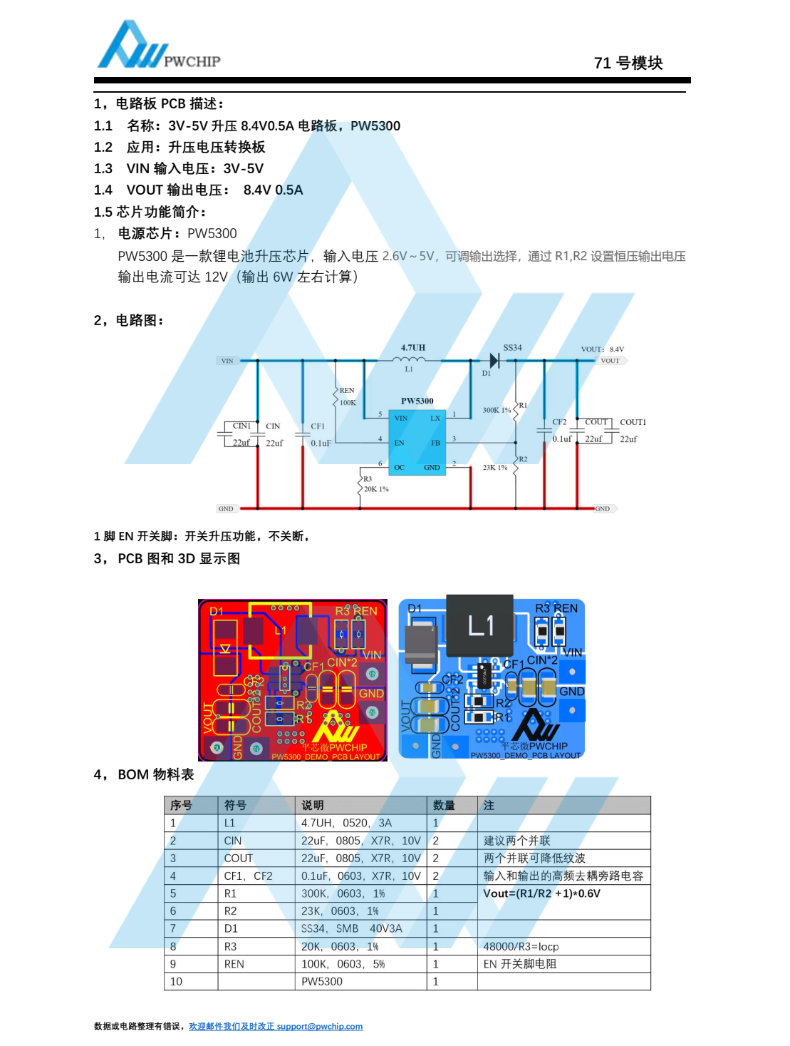:1, 电路板 PCB 描述:1.1 名称: 3V-5V 升压 8.4V0.5A 电路板, PW53001.2 应用: 升压电压转换板1.3 VIN 输入电压: 3V-5V1.4 VOUT 输出电压: 8.4V 0.5A