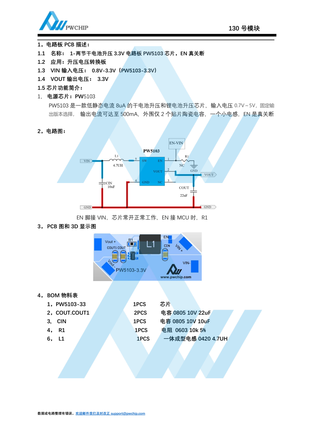 :1, 电路板 PCB 描述:1.1 名称: 1-两节干电池升压 3.3V 电路板 PW5103 芯片, EN 真关断1.2 应用: 升压电压转换板1.3 VIN 输入电压: 0.8V-3.3V(PW5103-3.3V)1.4 VOUT 输出电压: 3.3V