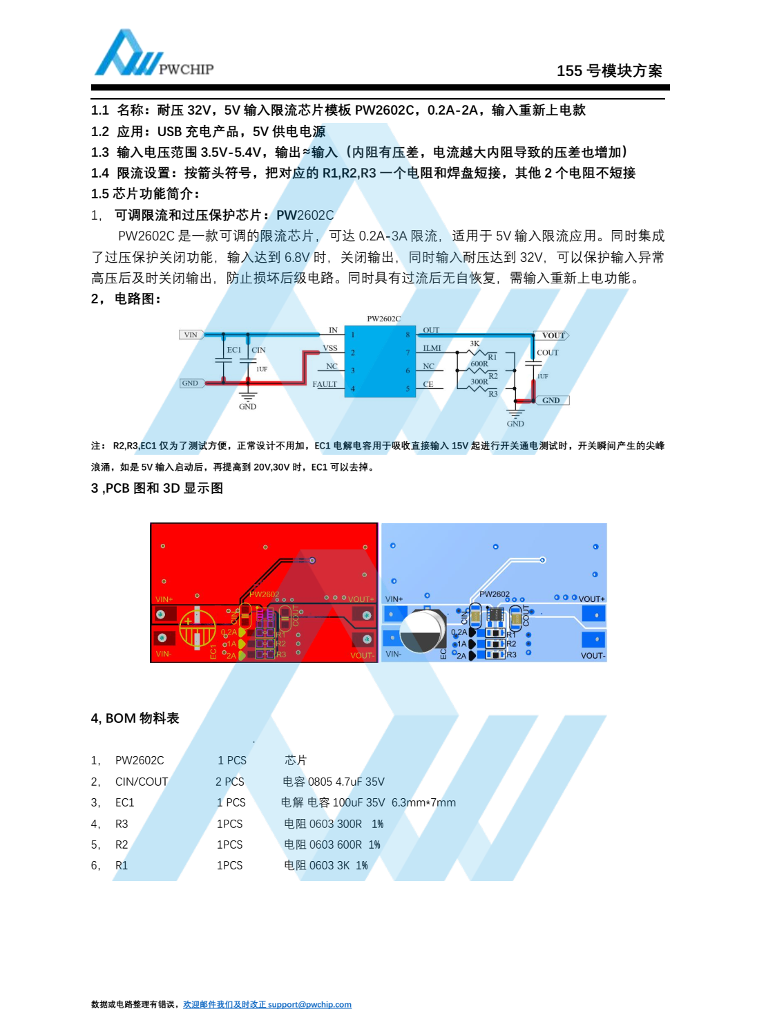 :1.1 名称: 耐压 32V, 5V 输入限流芯片模板 PW2602C, 0.2A-2A, 输入重新上电款1.2 应用: USB 充电产品, 5V 供电电源1.3 输入电压范围 3.5V-5.4V, 输出≈输入(内阻有压差, 电流越大内阻导致的压差也增加)1.4 限流设置: 按箭头符号, 把对应的 R1,R2,R3 一个电阻和焊盘短接, 其他 2 个电阻不短接