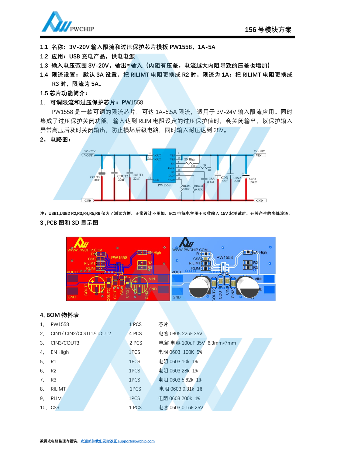 :1.1 名称: 3V-20V 输入限流和过压保护芯片模板 PW1558, 1A-5A1.2 应用: USB 充电产品, 供电电源1.3 输入电压范围 3V-20V, 输出≈输入(内阻有压差, 电流越大内阻导致的压差也增加)1.4 限流设置: 默认 3A 设置, 把 RILIMT 电阻更换成 R2 时, 限流为 1A; 把 RILIMT 电阻更换成R3 时, 限流为 5A。