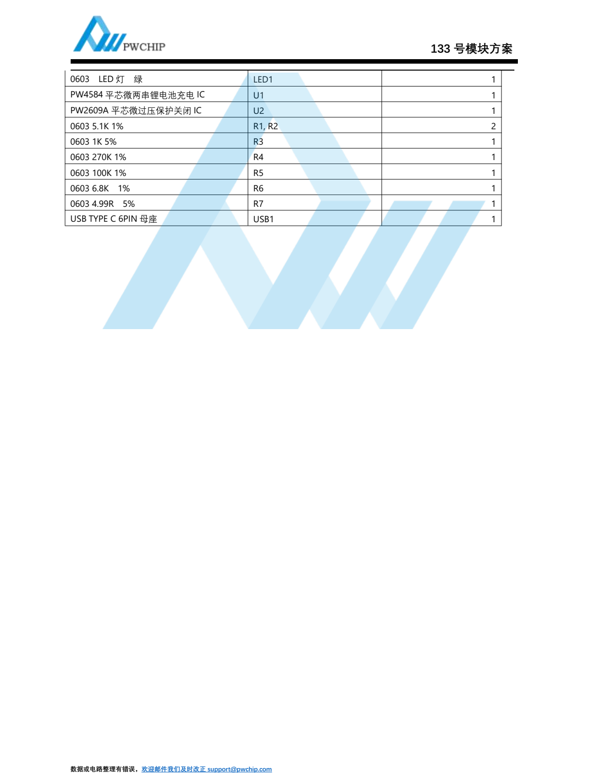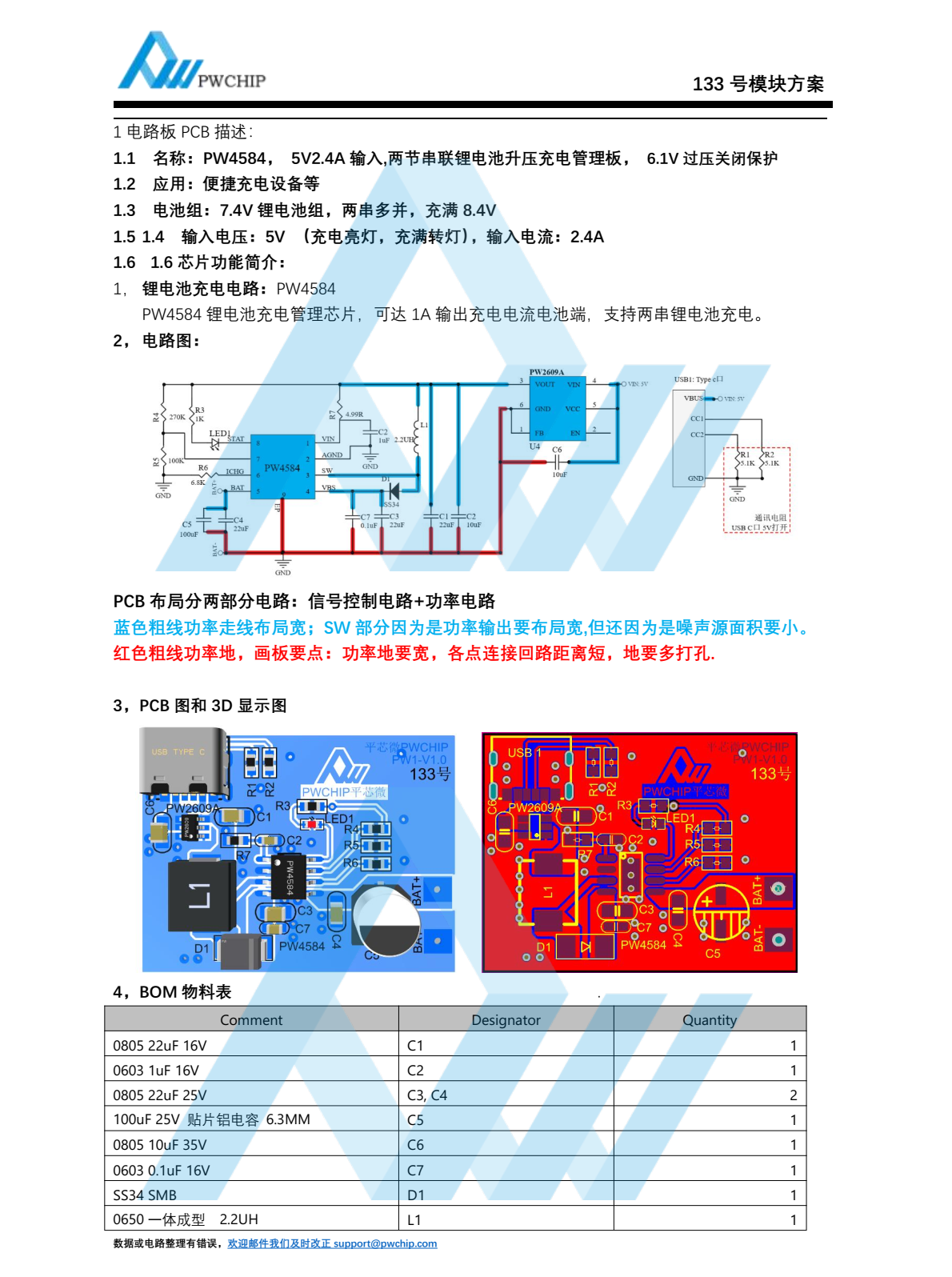 :1 电路板 PCB 描述:1.1 名称: PW4584, 5V2.4A 输入,两节串联锂电池升压充电管理板, 6.1V 过压关闭保护1.2 应用: 便捷充电设备等1.3 电池组: 7.4V 锂电池组, 两串多并, 充满 8.4V1.5 1.4 输入电压: 5V (充电亮灯, 充满转灯) , 输入电流: 2.4A