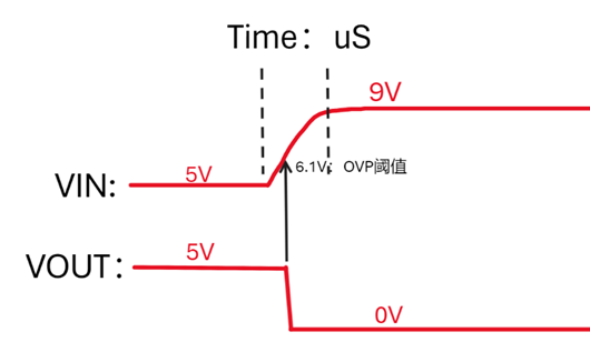 3, 当输入电压从 5V提高到 9V时,电压在 uS时间下看是斜坡形上升的(需用示波器查看),由于 OVP过压保护芯片的目的是保护后级电路的安全,不受高压的危险,导致损坏后级电路,所以要求 OVP过压保护芯片需要要过快的响应时间,平芯微的以下 4款 OVP过压保护产品,都具有极快的 OVP响应时间 0.05uS,在 OVP阈值达到时,快速关闭芯片内置 MOS,使得无输出电压,保护后级电路。
