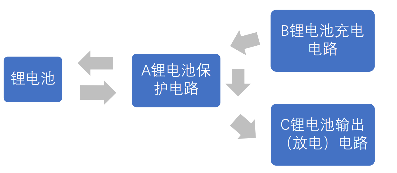 A 锂电池保护电路:控制锂电池的充电过流和锂电池输出过流最大值, 检测锂电池的放电最低电池电压阈值,充电充满最高电池电压阈值等等,达到阈值将进行开关动作,开关导通锂电池的充电和放电。