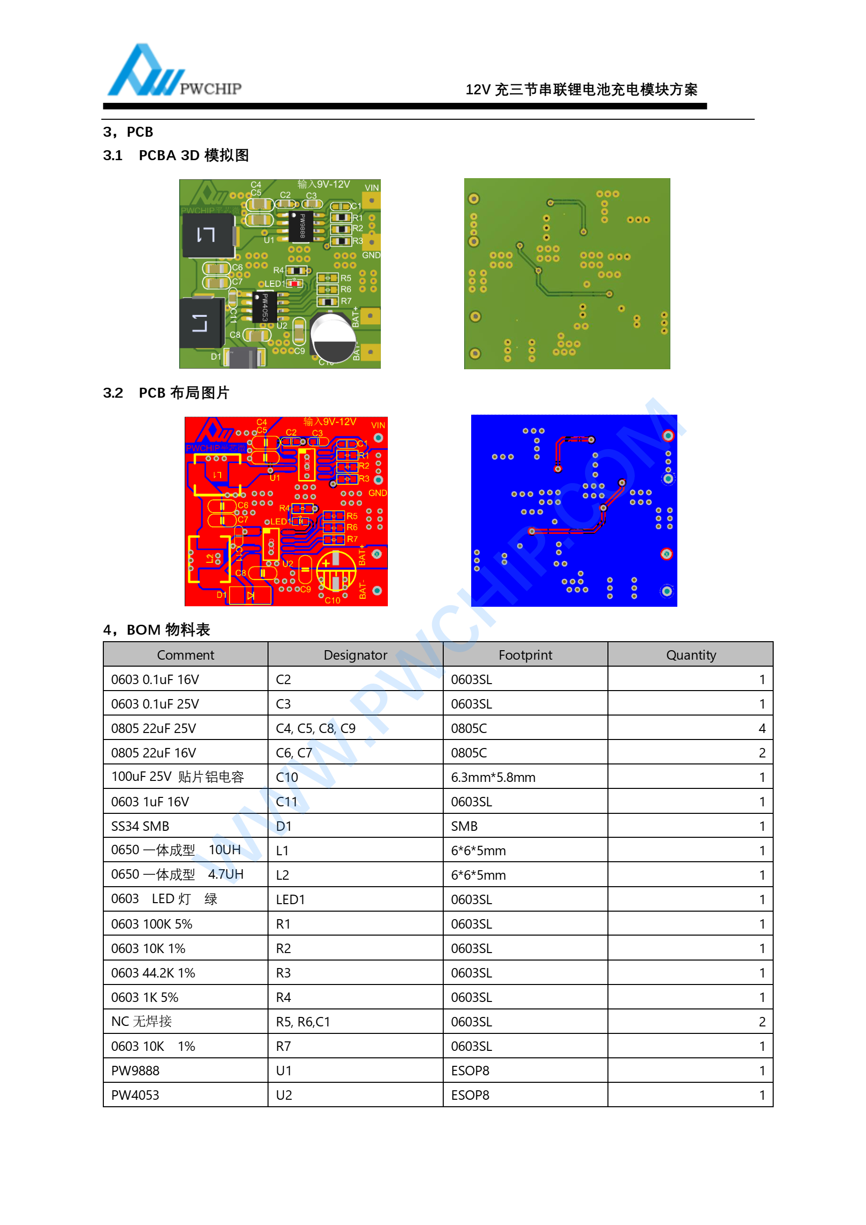 :方案名: 12V 给三节串联锂电池充电模块1.2 应用:便捷充电设备等1.3 电池组: 11.1V/12.6V 锂电池组, 三节串联,或者三串多并1.4 输入 VIN: 9V-12V (充电亮灯,充满灭灯,不接电池是闪灯)1.5 充电电流: 1A (Max)
