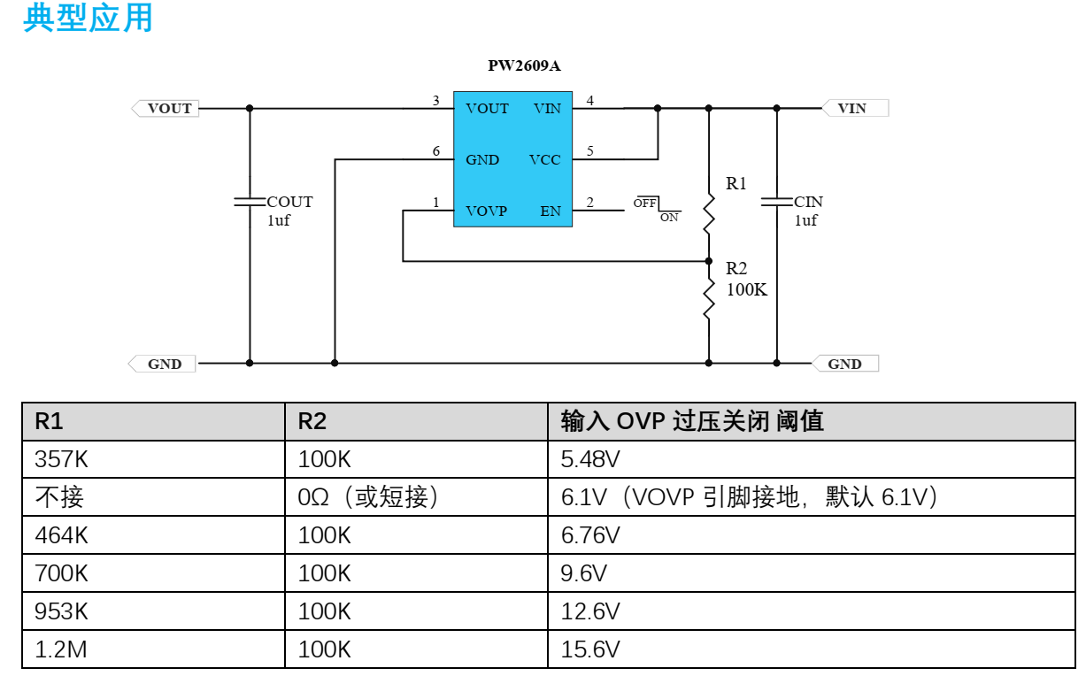 PW2609A的核心优势在于其过压保护阈值的高度灵活性。用户可通过VOVP引脚外接两个电阻(R1、R2)构成分压网络,在 4V至24V范围内精确设定保护点。