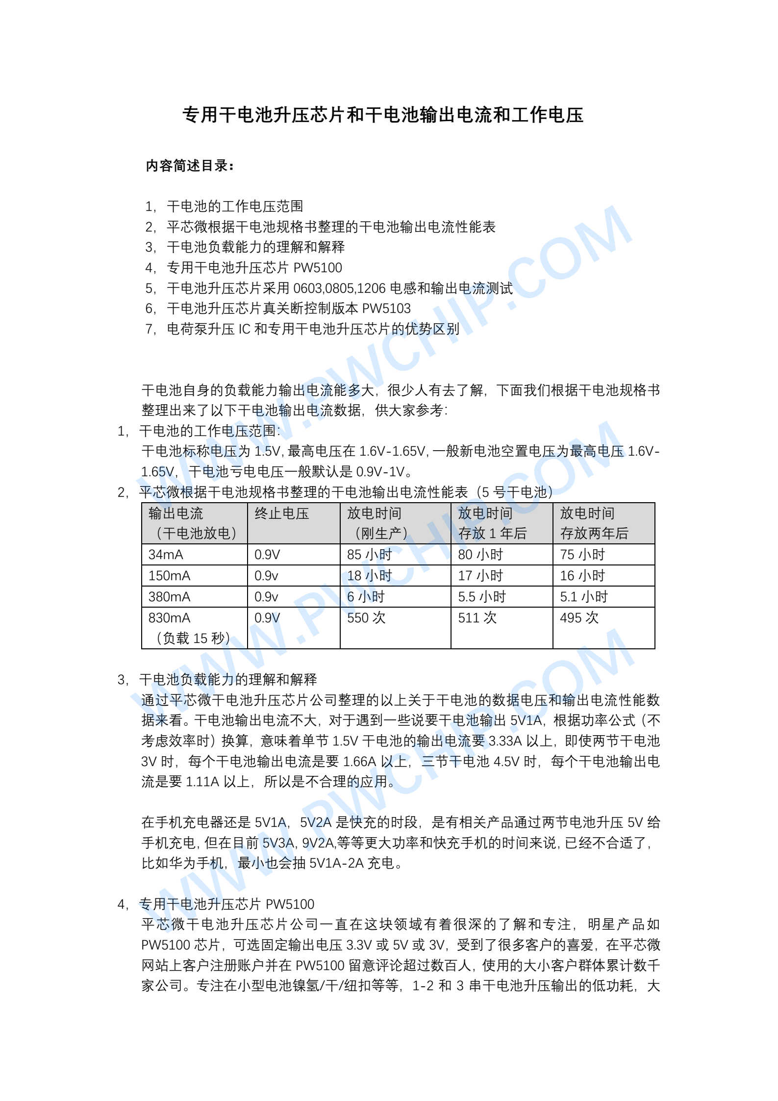 内容简述目录:1,干电池的工作电压范围2,平芯微根据干电池规格书整理的干电池输出电流性能表3,干电池负载能力的理解和解释4,专用干电池升压芯片 PW51005,干电池升压芯片采用 0603,0805,1206 电感和...