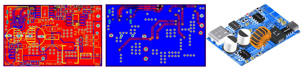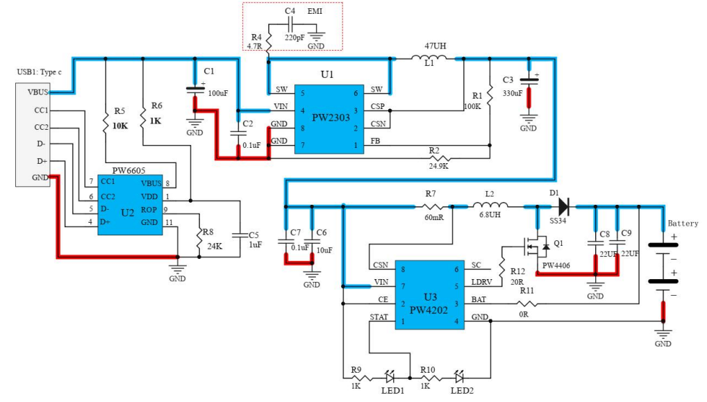 Note2: The red thick line is the power ground,the main points of the drawing board: to be wide, the shorter the distance between the connecting loops at each point, the more holes are punched in theground. (Input, C1, C2, PW2303 pin 7/8, C3, C7, C6, C8, C9, Q1 and the batteryground)