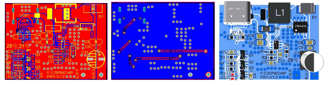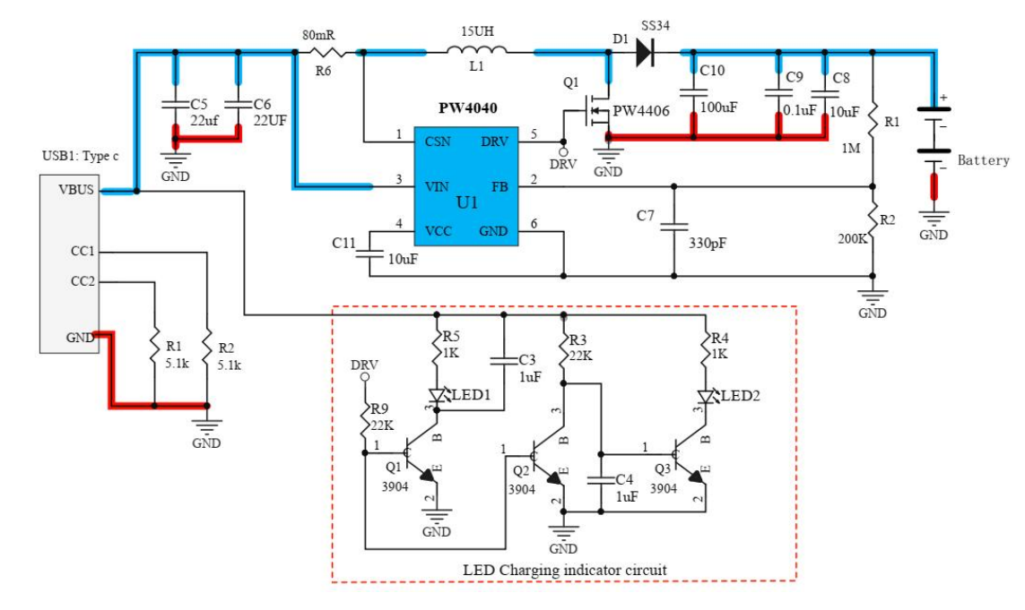 Note 2: The red thick line is the power ground, the main points of the drawing board: to bewide, the shorter the distance between the connecting loops at each point, the more holes are punched in the ground.(input, C5, C6, C10, C9, C8,Q1 and battery ground)