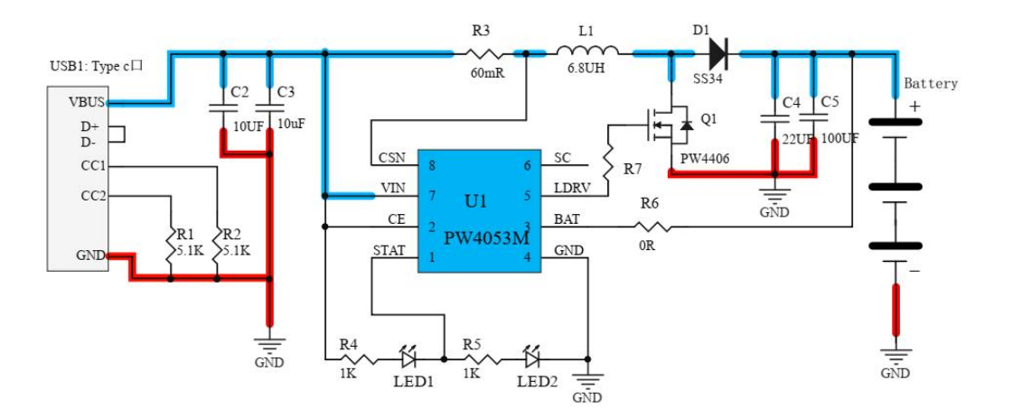 Note 2: The red thick line is the power ground, the main points of the drawing board: to bewide, the shorter the distance between the connecting loops at each point, the more holes are punched in the ground.(input, C5, C6, C10, C9, C8,Q1 and battery ground)