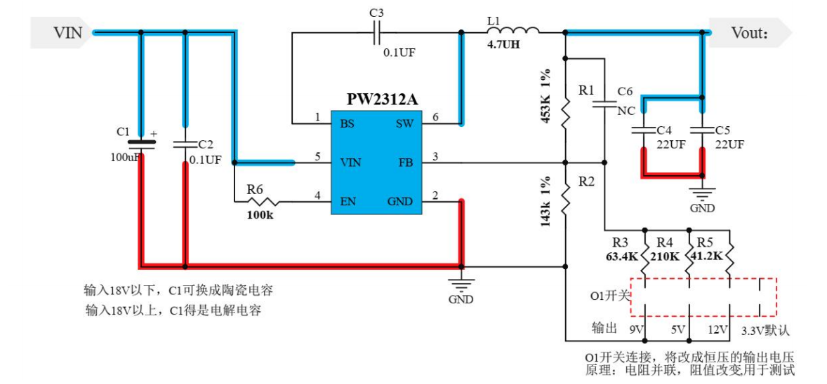 PW2312A input voltage is 6.5V~55V, you can set the constant voltage output voltage value byR1,R2, current up to 0.6A, package SOT23-6.