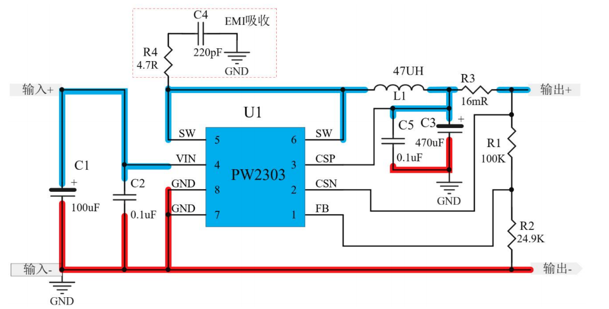 Note 2: The red thick line is the power ground, the main points of the drawing board: to be wide, the shorter the distance between the connecting loops at each point.