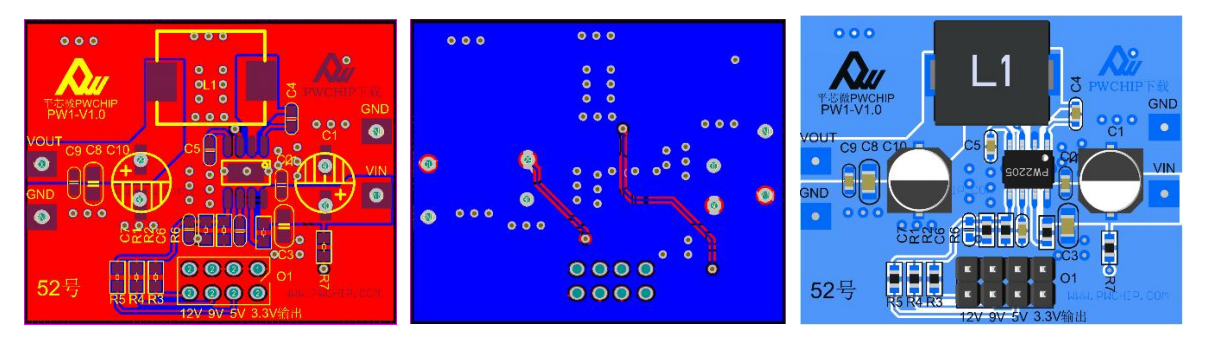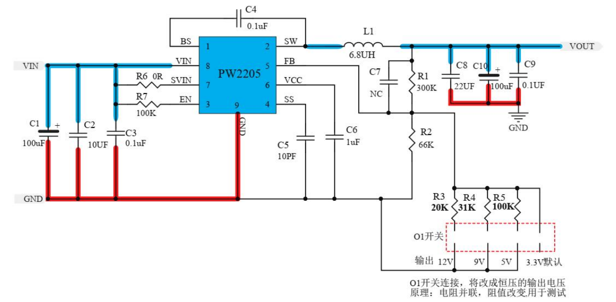 PW2205 input voltage is 4.5V~30V, you can set the constant voltage output voltage value by R1,R2, current up to 5A, package ESOP8.