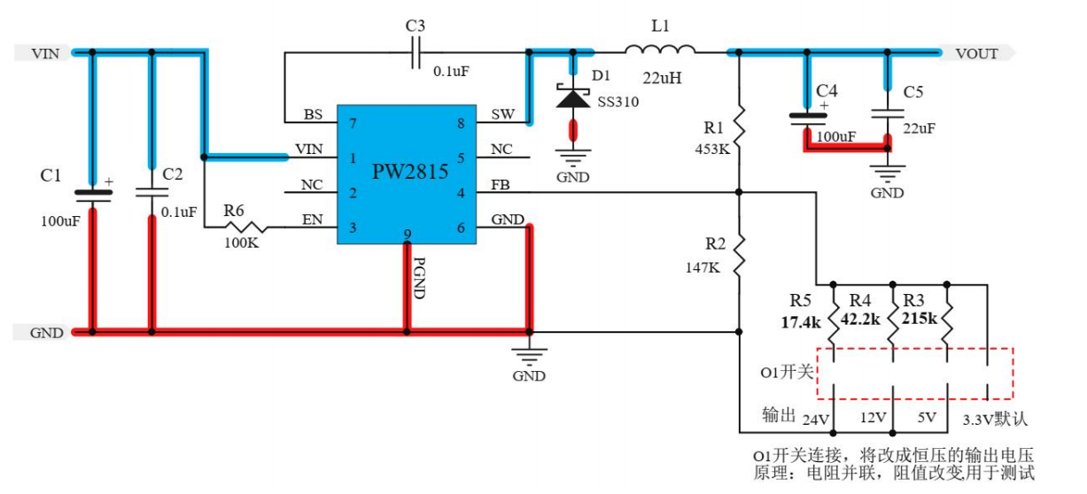 PW2815 input voltage is 4.5V~80V, you can set the constant voltage output voltage value by R1,R2, current up to 1.5A, package ESOP8.