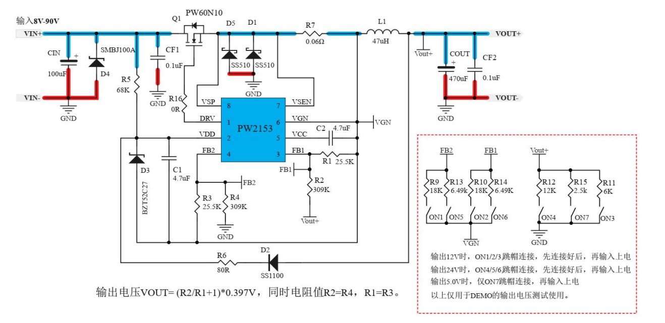 PW2153 input voltage is 8V~120V, you can set the constant voltage output voltage value byR1,R2, R3,R4,current up to 10A(120W output power), output can be set in the range of 5V-30V,package SOP8.