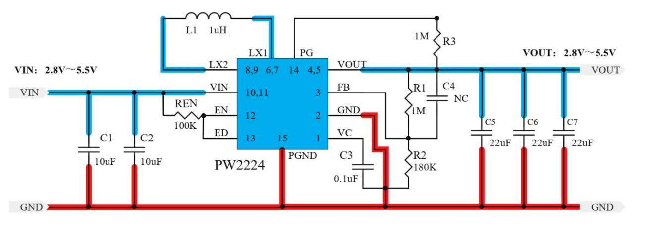 PW2224 input voltage is 2.8V~5.5V, you can set the constant voltage output voltage value byR1,R2, current up to 3A(3A in buck mode, 1A output recommended for boost mode),package DFN14.